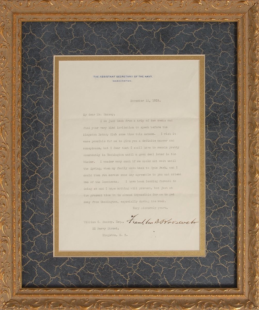 TLS, one page, 7 x 9.25, The Assistant Secretary of the Navy letterhead, November 12, 1919. Letter to William C. Hussey, in full: “I am just back from a trip of two weeks and find your very kind invitation to speak before the Kingston Rotary Club some time this Autumn. I wish it were possible for me to give you a definite answer and acceptance, but I fear that I shall have to remain pretty constantly in Washington until a good deal later in the Winter. I wonder very much if we could not wait until the Spring, when my family move back to Hyde Park, and I could then run across some day agreeable to you and attend one of the luncheons. I have been looking forward to doing so and I hope nothing will prevent, but just as the present time it is almost impossible for me to get away from Washington, especially during the week.” Framed and in fine condition.