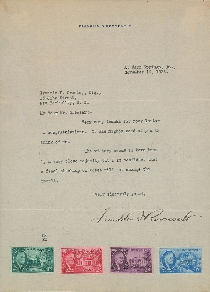 TLS, one page, 7.25 x 10, personal letterhead, November 16, 1928. Letter to Francis F. Greeley, written within two weeks of his election as governor of New York. In full: “Very many thanks for your letter of congratulations. It was mighty good of you to think of me. The victory seems to have been by a very close majority but I am confident that a final check-up of votes will not change the result.” Four colorful postage stamps honoring FDR are affixed at the bottom, and the sheet is affixed to a slightly larger scrapbook page. In fine condition.