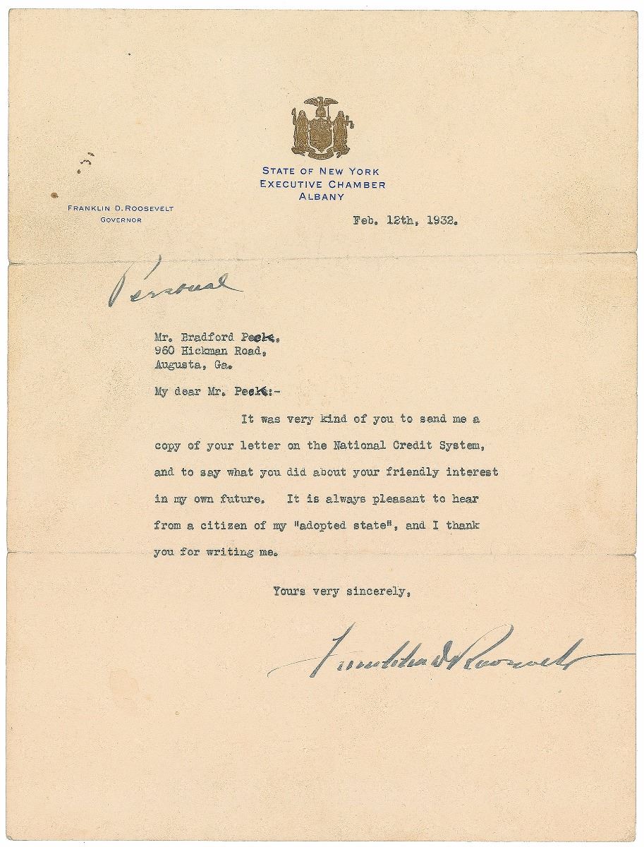 TLS, one page, 8 x 10.5, State of New York Executive Chamber letterhead, February 12, 1932. Letter to Bradford Peek of Augusta, Georgia. In full: “It was very kind of you to send me a copy of your letter on the National Credit System, and to say what you did about your friendly interest in my own future. It is always pleasant to hear from a citizen of my ‘adopted state,’ and I thank you for writing me.” In fine condition.