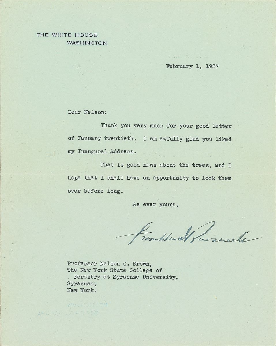 TLS as president, one page, 7 x 8.75, White House letterhead, February 1, 1937. Letter to Nelson C. Brown, in full: “Thank you very much for your good letter of January twentieth. I am awfully glad you liked my Inaugural Address. That is good news about the trees, and I hope that I shall have an opportunity to look them over before long.” In fine condition. Accompanied by the original mailing envelope.