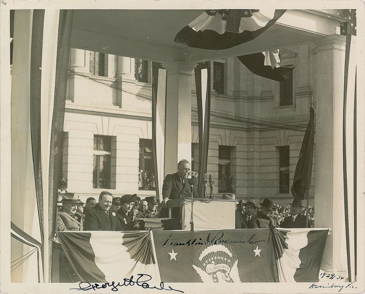 Uncommon glossy 10 x 8 photo of FDR giving a campaign speech in Harrisburg on October 29, 1936, signed in fountain pen by the president, “Franklin D. Roosevelt,” and by the governor of Pennsylvania, “George H. Earle.” In fine condition, with a diagonal crease to lower right passing through the end of the signature. Roosevelt would win the 1936 election in a landslide just five days later, winning every state but Vermont and Maine.