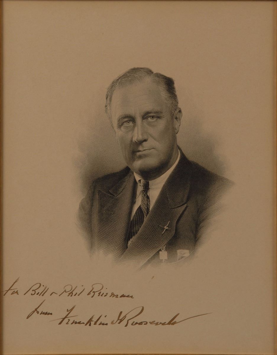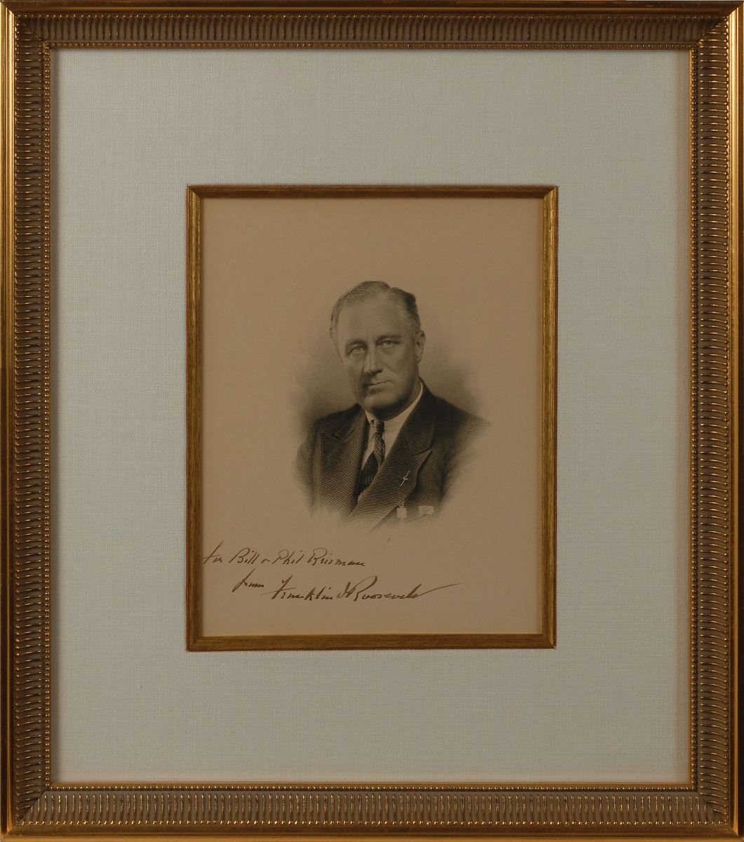 Superb engraved portrait of President Roosevelt, 6.75 x 8.75, signed and inscribed in fountain pen, “For Bill & Phil Reisman, from Franklin D. Roosevelt.” Nicely cloth-matted and framed to an overall size of 14.75 x 16.75. In fine condition.