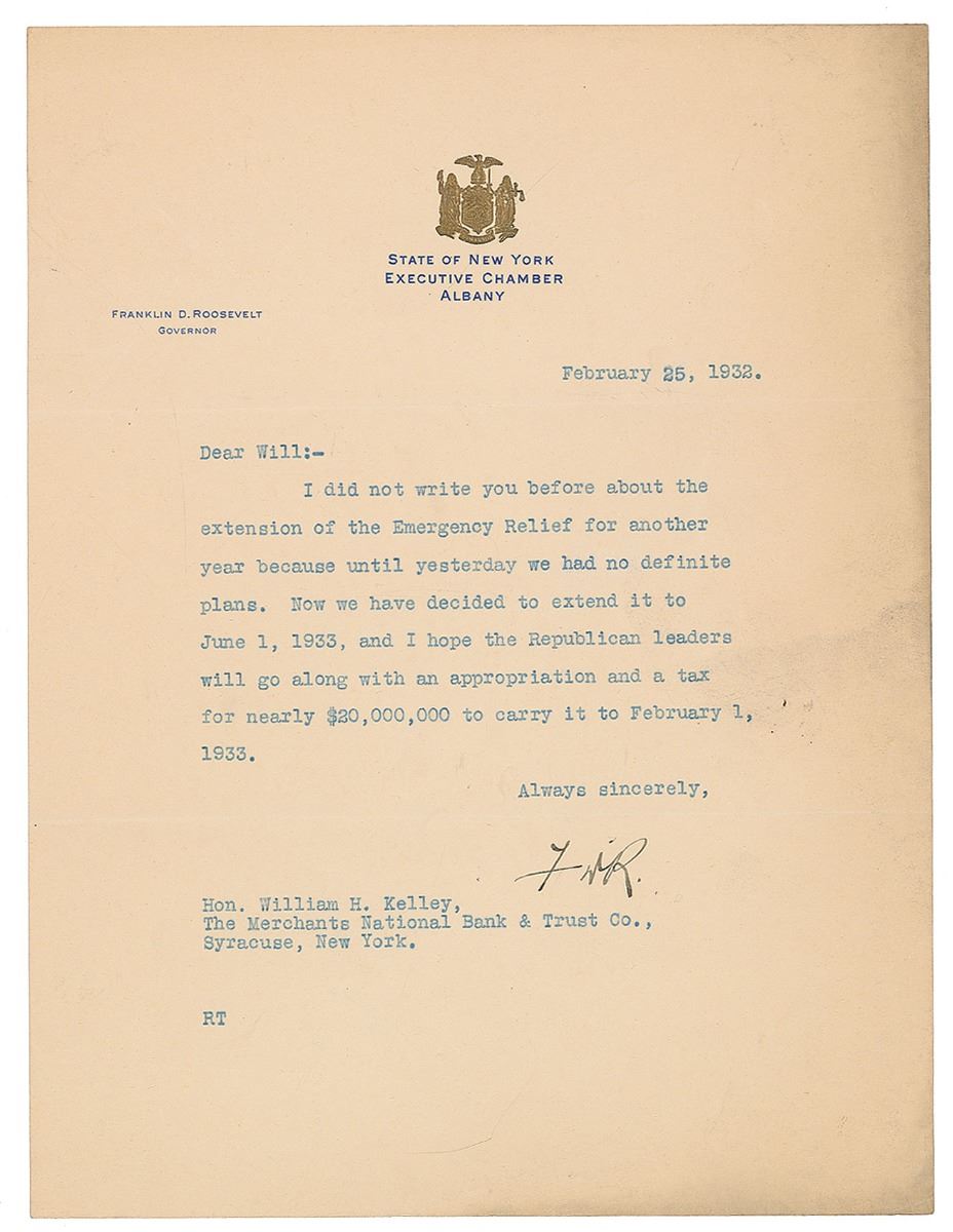 TLS signed “FDR,” one page, 8 x 10.5, State of New York letterhead, February 25, 1932. Letter to William H. Kelley, in full: “I did not write you before about the extension of the Emergency Relief for another year because until yesterday we had no definite plans. Now we have decided to extend it to June 1, 1933, and I hope the Republican leaders will go along with an appropriation and a tax for nearly $20,000,000 to carry it to February 1, 1933.” In fine condition, with light edge toning and soiling.