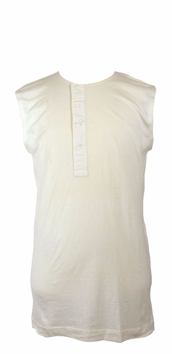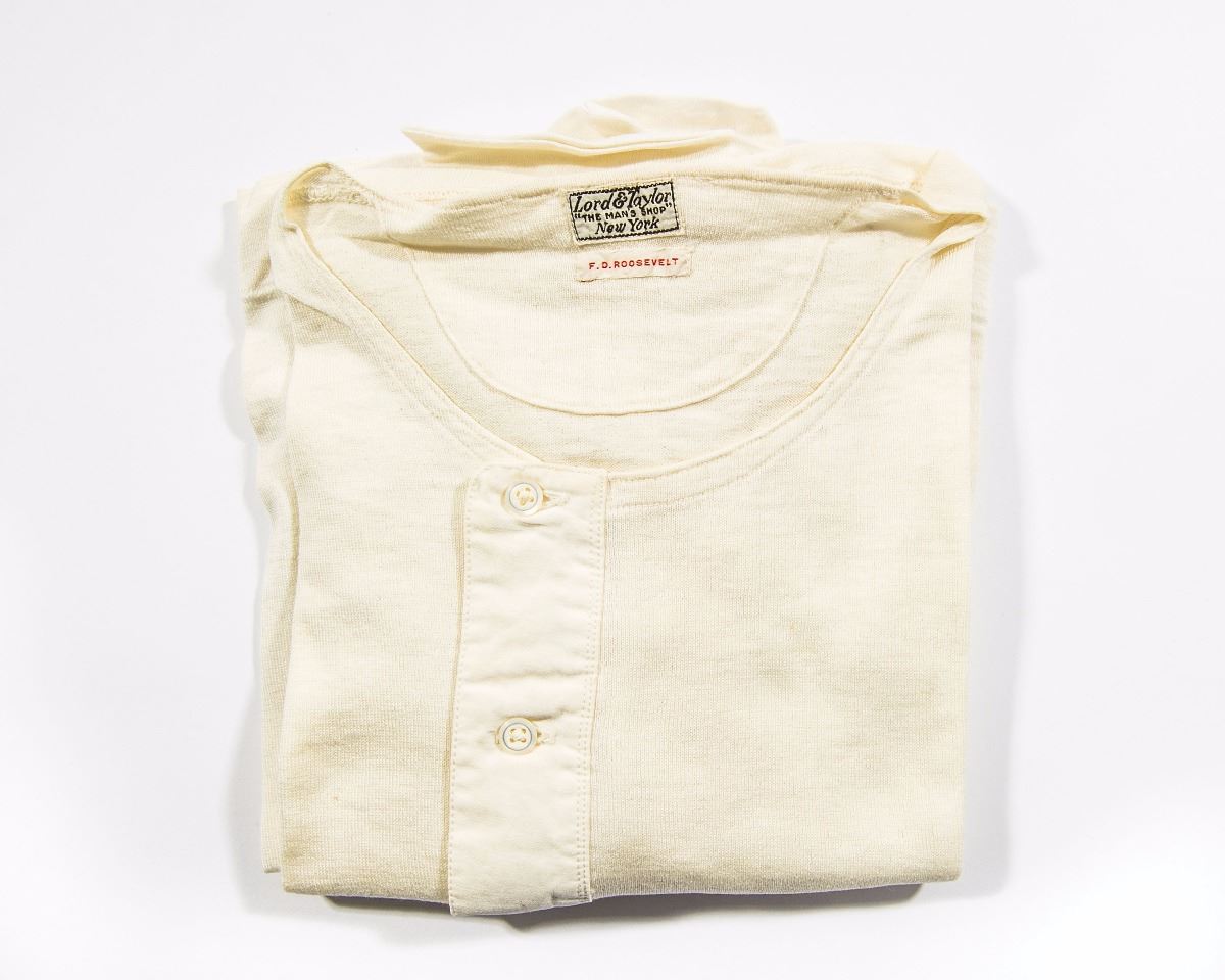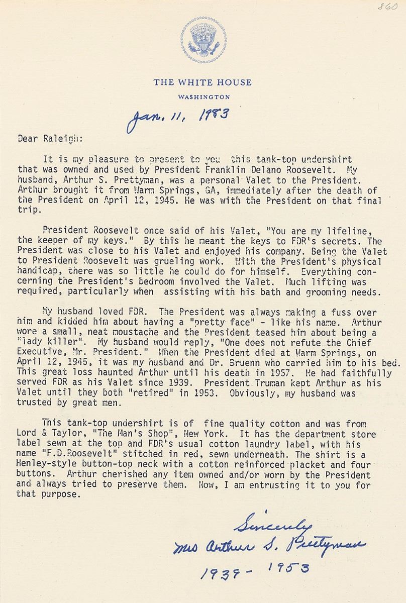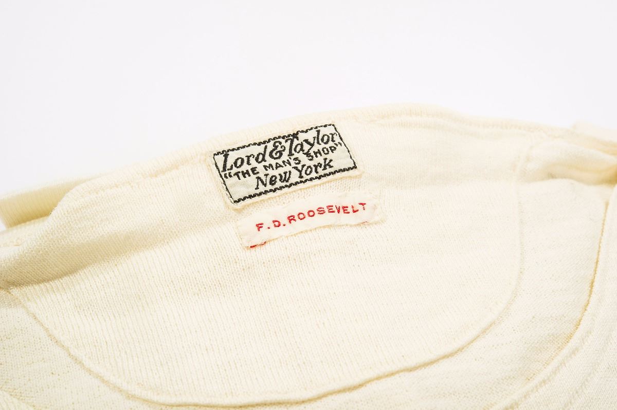 President Roosevelt's personally-owned and -worn off-white cotton tank-top undershirt made by Lord & Taylor, the well-known upscale store in New York and Washington, DC. The manufacturer's tag is sewn into the collar area, below which is a small white tag embroidered in red with the president's name, "F. D. Roosevelt." Includes a detailed letter of provenance on White House letterhead from the wife of Arthur S. Prettyman, who had served as Roosevelt's valet from 1939 until his death in 1945, and continued to work for President Truman until he left office, in 1953. In part: "It is my pleasure to present to you this tank-top undershirt that was owned and used by President Franklin Delano Roosevelt. My husband, Arthur S. Prettyman, was a personal Valet to the President. Arthur brought it from Warm Springs, GA, immediately after the death of the President on April 12, 1945. He was with the President on that final trip…This tank-top undershirt is of fine quality cotton and was from Lord & Taylor, 'The Man's Shop,' New York. It has the department store label sewn at the top and FDR's usual cotton laundry label…The shirt is a Henley-style button-top neck with a cotton reinforced placket and four buttons. Arthur cherished any item owned and/or worn by the President and always tried to preserve them." A poignant, personally-worn item from Roosevelt's final days. From the Raleigh DeGeer Amyx Collection.