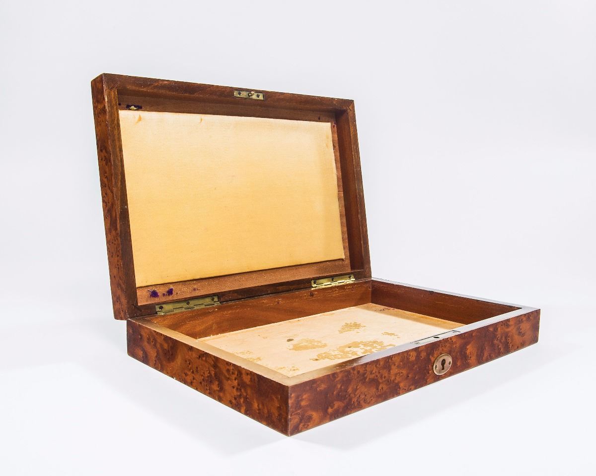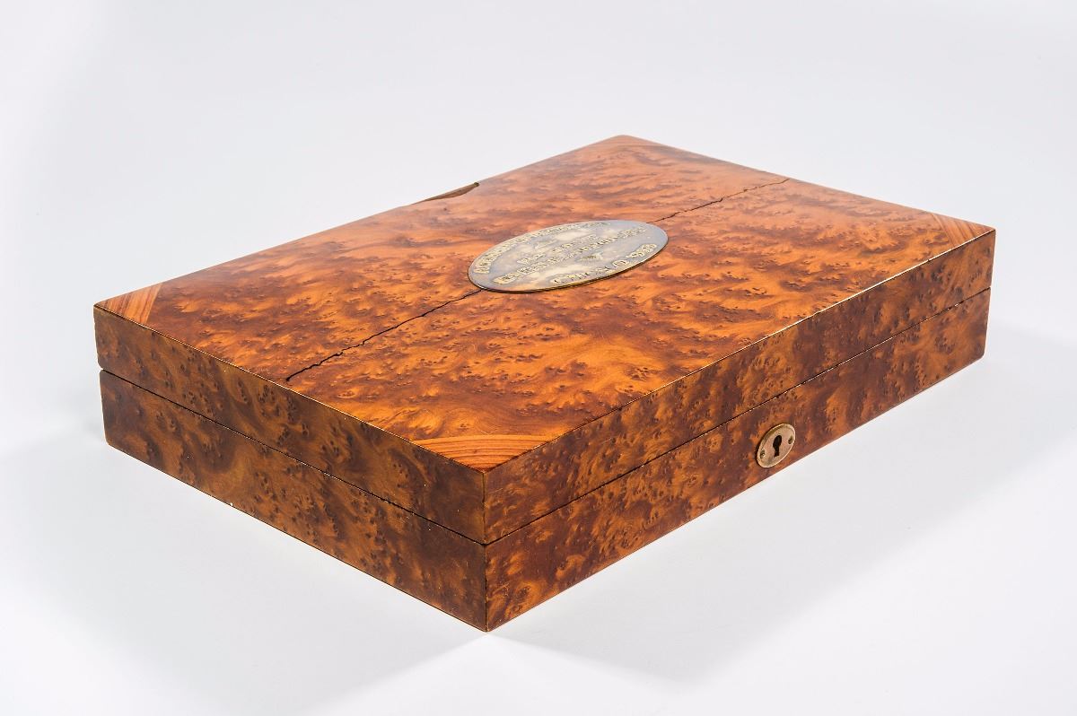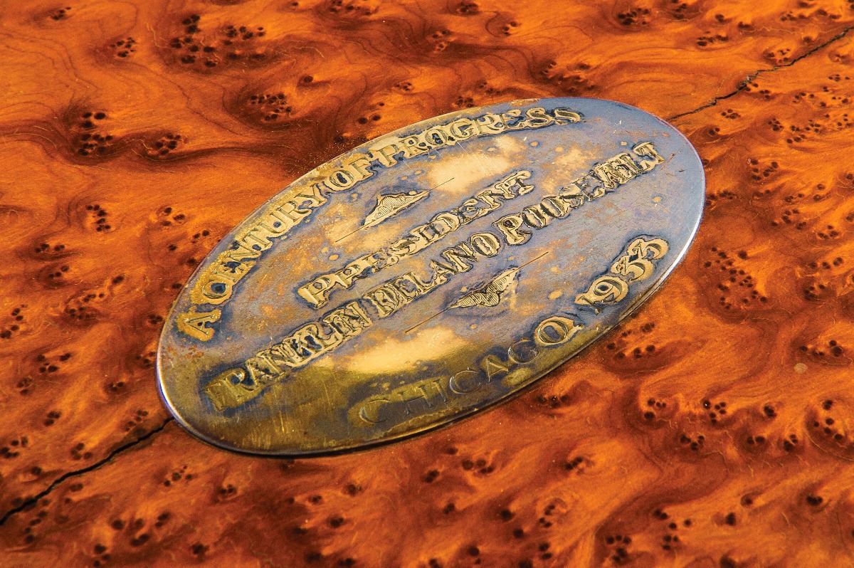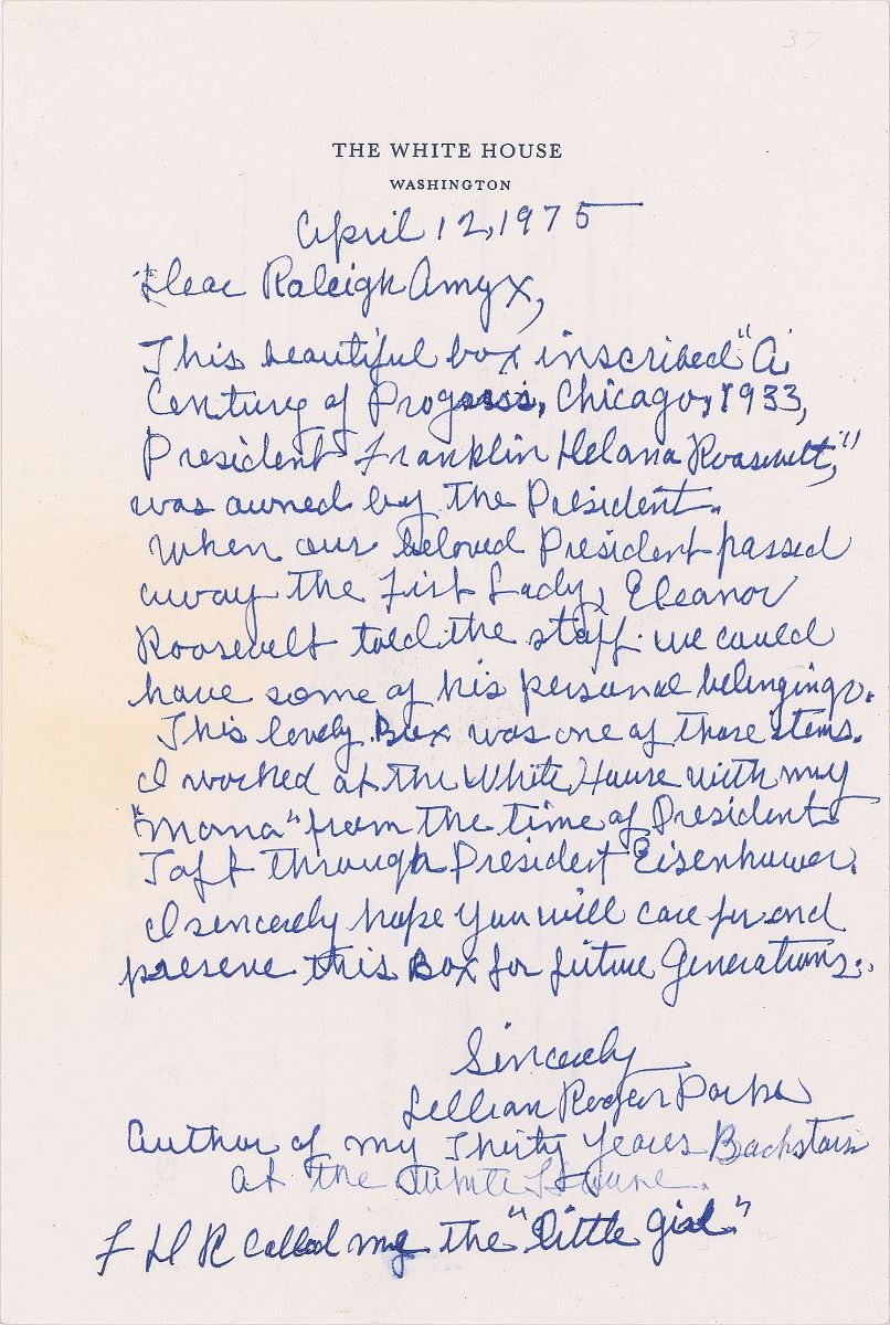 President Roosevelt’s personally-owned positively gorgeous wooden box with a burl veneer, measuring 11 x 7.5 x 2.25, featuring a metal plate on the top with a presentation inscription, “A Century of Progress, President Franklin Delano Roosevelt, Chicago 1933.” A thin crack passes through the center and there is a chip to the veneer on the top edge. The interior is lined with padded cloth on the top and lining on the bottom appears to have been removed. Includes a detailed letter of provenance on White House letterhead from Lillian Rogers Parks, who was a housekeeper and seamstress at the White House for over 30 years, from Hoover through Eisenhower. In part: “This beautiful box…was owned by the president. When our beloved president passed away the first lady, Eleanor Roosevelt told the staff we could have some of his personal belongings. This lovely box was one of those items.” An incredibly personal and impressive FDR relic with the potential for a handsome display. From the Raleigh DeGeer Amyx Collection.