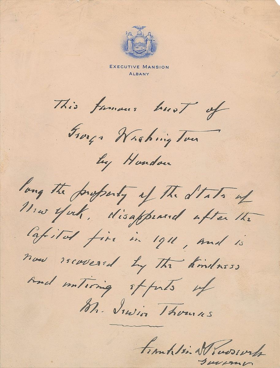 ANS signed “Franklin D. Roosevelt, Governor,” one page, 8 x 10.5, Executive Mansion letterhead, no date but between the years of 1929 and 1932. In full: "This famous bust of George Washington by Houdon, long the property of the State of New York, disappeared after the Capitol fire in 1911, and is now recovered by the kindness and untiring efforts of Mr. Irwin Thomas." In very good to fine condition, with scattered light creasing, primarily to the upper corners.