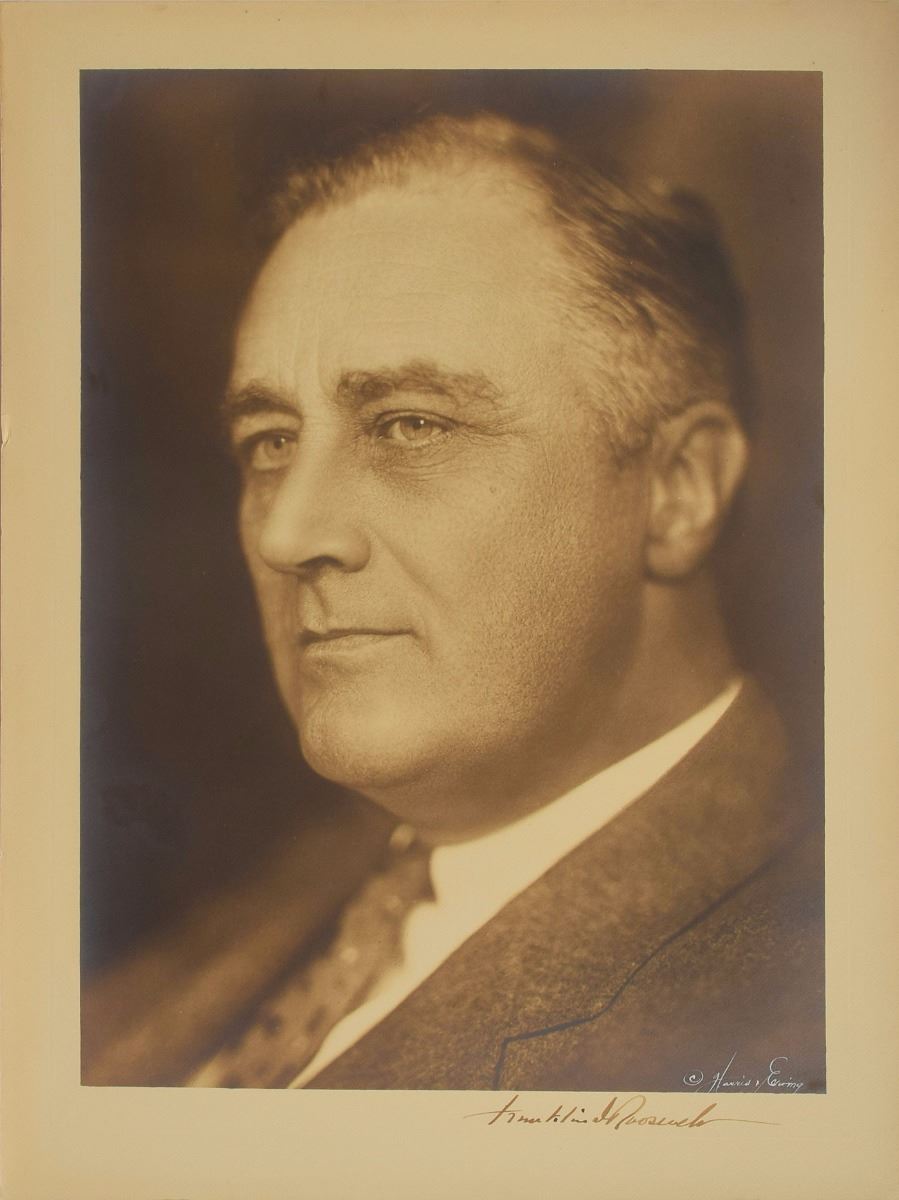 Mammoth matte-finish 14 x 20 close-up portrait of Roosevelt by Harris & Ewing, boldly signed in the lower border in fountain pen, "Franklin D. Roosevelt." Also signed in white ink by the studio. In fine condition, with a hint of mild silvering to darker areas of the image.