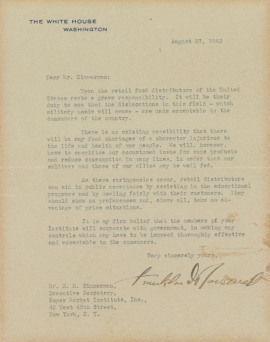 TLS as president, one page, 6.5 x 8.5, White House letterhead, August 27, 1942. Letter to M. M. Zimmerman of the Super Market Institute, in part: "Upon the retail food distributors of the United States rests a grave responsibility. It will be their duty to see that the dislocations in this field—which military needs will cause—are made acceptable to the consumers of this country. There is no existing possibility that there will be any food shortages of a character injurious to the life and health of our people. We will, however, have to sacrifice our accustomed taste for some products and reduce consumption in many lines, in order that our soldiers and those of our allies may be well fed. As these stringencies occur, retail distributors can aid in public acceptance by assisting in their educational programs and by dealing fairly with their customers. They should show no preference and, above all, take no advantage of price situations. It is my firm belief that the members of your Institute will cooperate with government, in asking any controls which may have to be imposed thoroughly effective and acceptable to the consumers." In fine condition, with light overall toning.