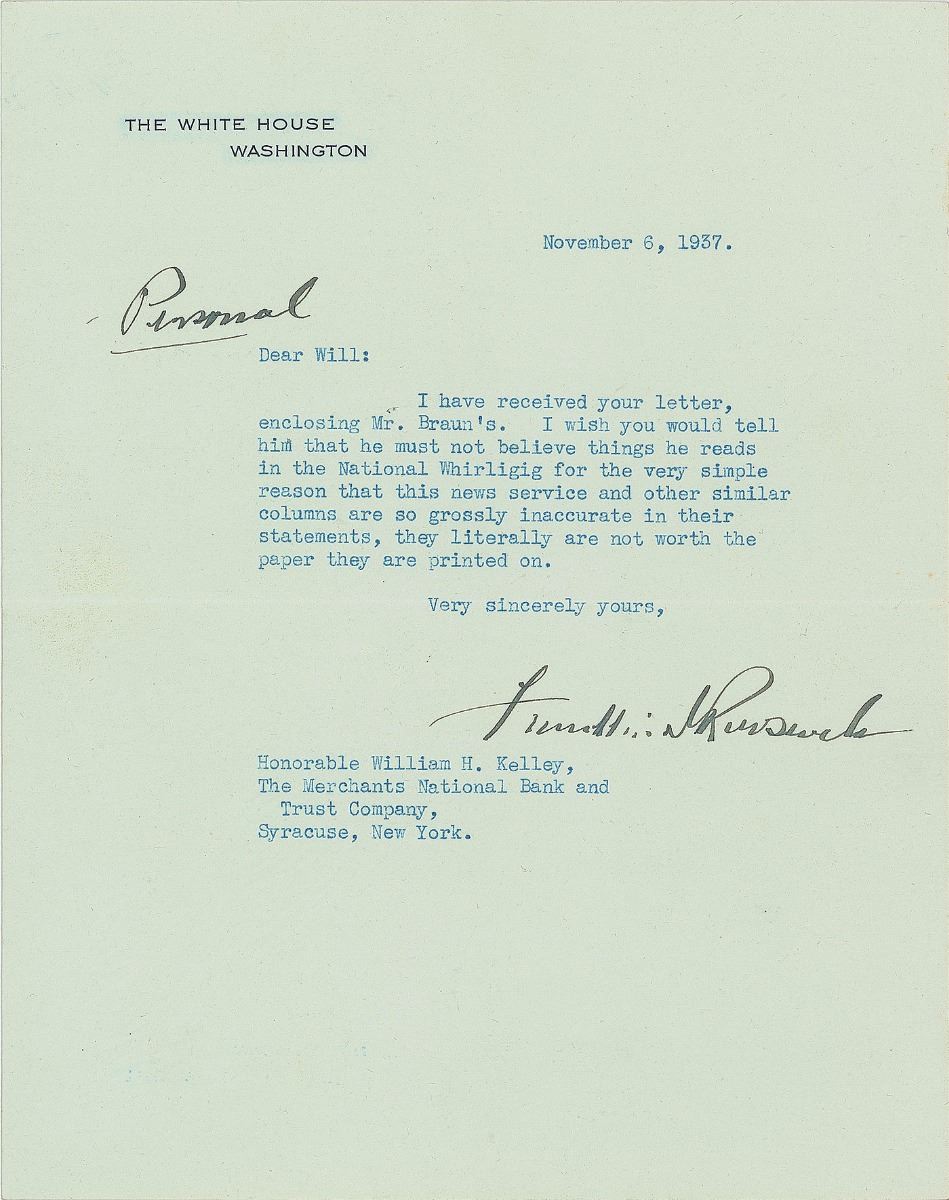 TLS as president, one page, 7 x 8.75, White House letterhead, November 6, 1937. Letter to William H. Kelley, the president of the Merchants National Bank and Trust, Co., in full: "I have received your letter, enclosing Mr. Braun's. I wish you would tell him that he must not believe things he reads in the National Whirligig for the very simple reason that this news service and other similar columns are so grossly inaccurate in their statements, they literally are not worth the paper they are printed on." Roosevelt writes "Personal" at the top in his own hand. In fine condition.