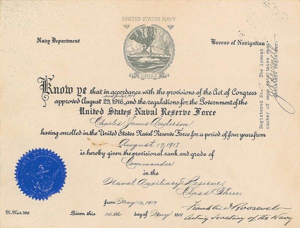 DS signed “Franklin D. Roosevelt, Acting Secretary of the Navy,” one page, 10.5 x 8, May 14, 1919. Official United States Navy commission, in part: “Know ye that in accordance with…the regulations for the Government of the United States Naval Reserve Force, Charles James Anderson…is hereby given the provisional rank and grade of Commander in the Naval Auxiliary Reserve, Class Three.” The blue seal affixed at lower left remains intact. In fine condition, with scattered soiling.