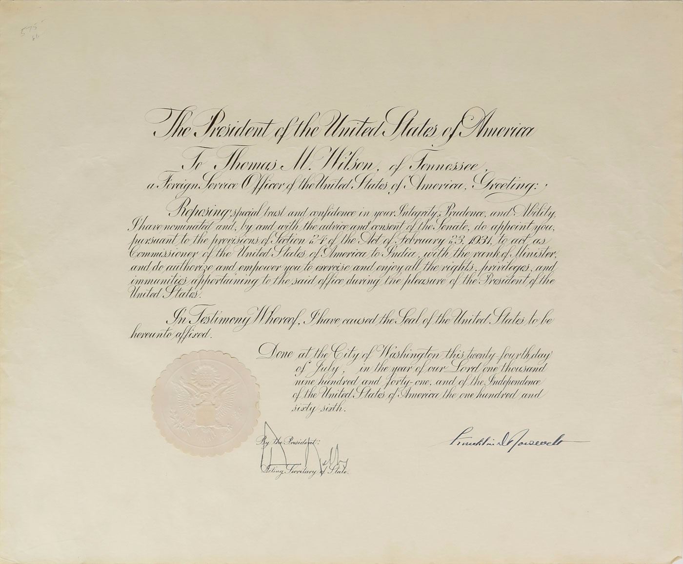 Manuscript DS as president, one page, 23 x 19, July 24, 1941. President Roosevelt appoints Thomas M. Wilson of Tennessee as "Commissioner of the United States of America to India with the rank of Minister." Boldly signed at the conclusion by Roosevelt and countersigned by Acting Secretary of State Sumner Welles. The white paper seal affixed to the lower left remains fully intact. In fine condition, with scattered light creasing. During his career, Thomas M. Wilson served as consul in China, Madras, and Bombay, as consul general in Sydney, and as minister/consul general in Iraq. This was a significant appointment in the history of the Indian independence movement, opening quasi-diplomatic relations between the United States and a not-yet-free India. Roosevelt did much to pressure Winston Churchill to modify British policy toward the nation, especially as India became a major base of operations against the Japanese in World War II.