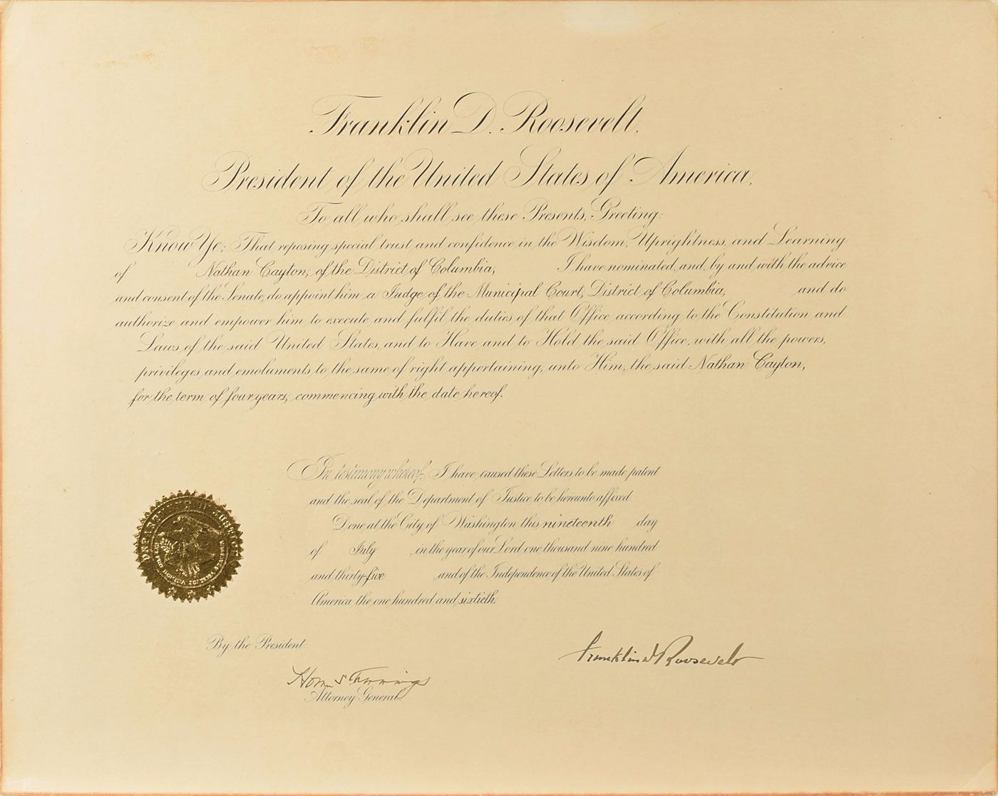 Partly-printed DS as president, one page, 20 x 16, July 19, 1935. President Roosevelt appoints Nathan Cayton, of the District of Columbia, as "a Judge of the Municipal Court, District of Columbia." Signed at the conclusion by Roosevelt, and countersigned by Attorney General Homer S. Cummings. Gold justice department seal remains affixed to lower portion. Affixed to a same-size sheet of heavy cardstock and in fine condition.
