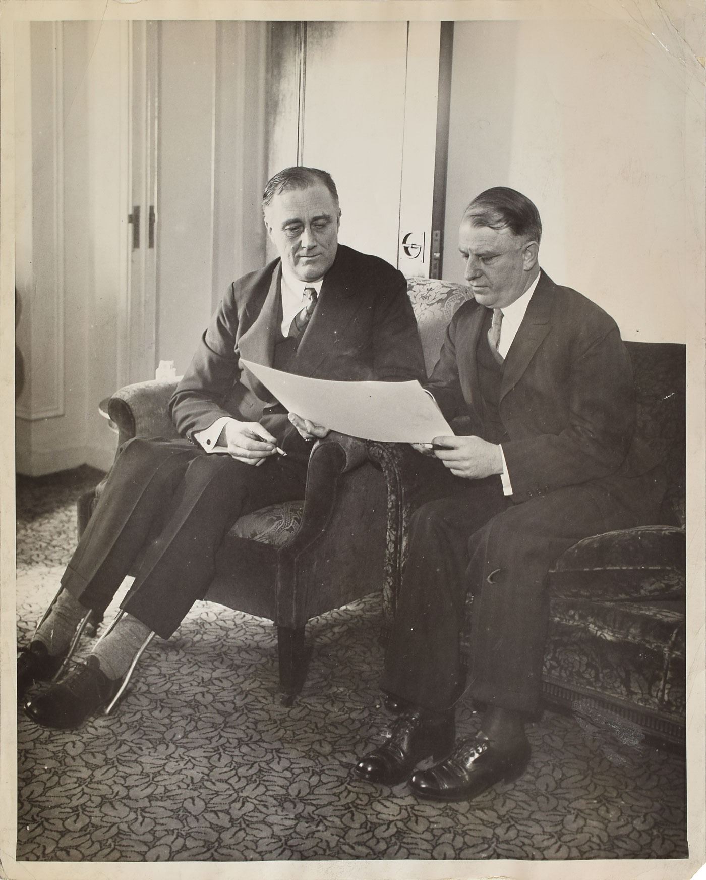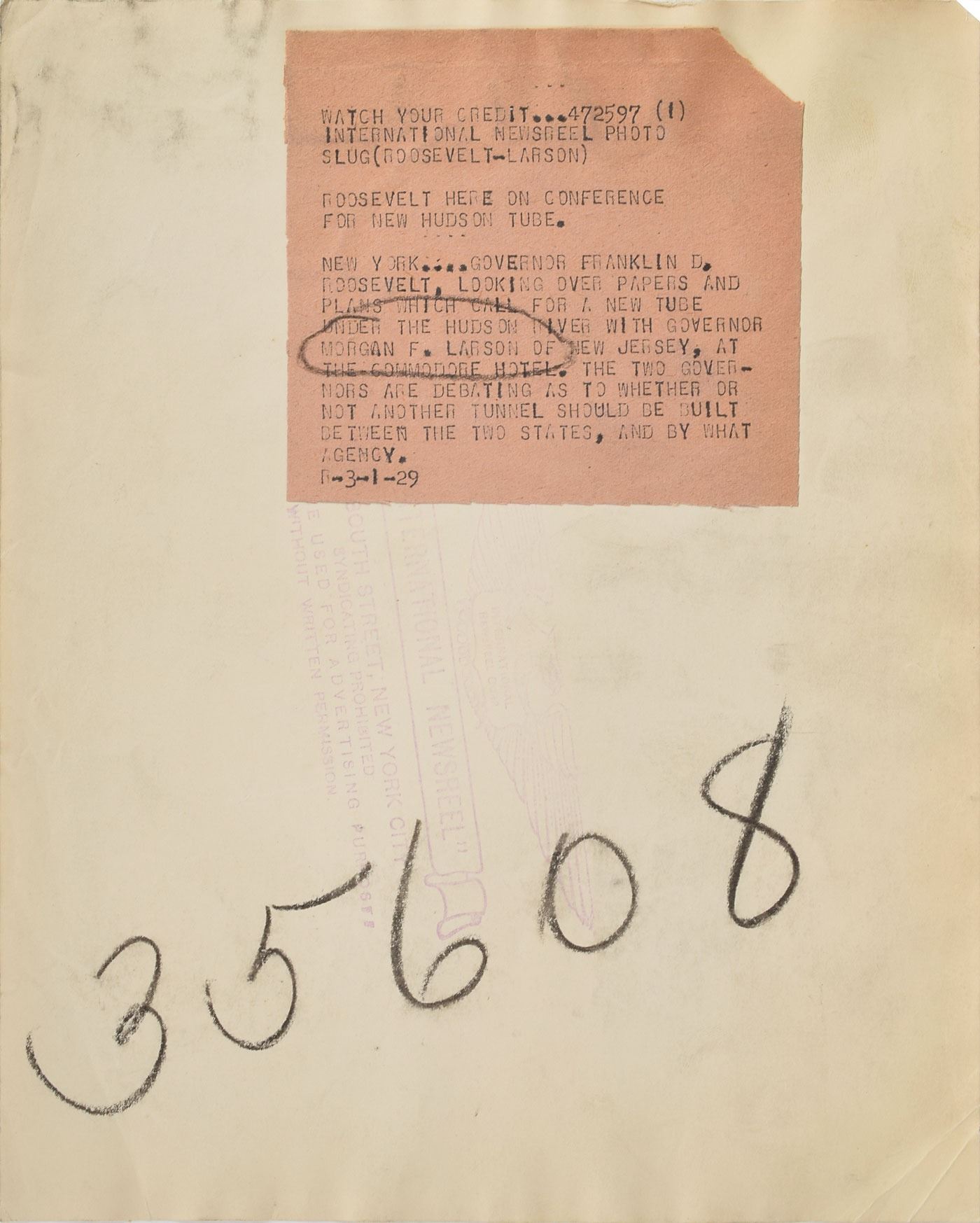 Original pearl-finish 8 x 9.75 press photo of Roosevelt taken in 1929, showing him meeting with Governor Morgan F. Larson of New Jersey concerning a potential project for a tunnel under the Hudson River; this is a rare image in which FDR's leg braces are clearly seen. Reverse bears an International Newsreel stamp and affixed caption. In very good to fine condition, with light rippling, creasing to corners, and a surface scuff to lower right.