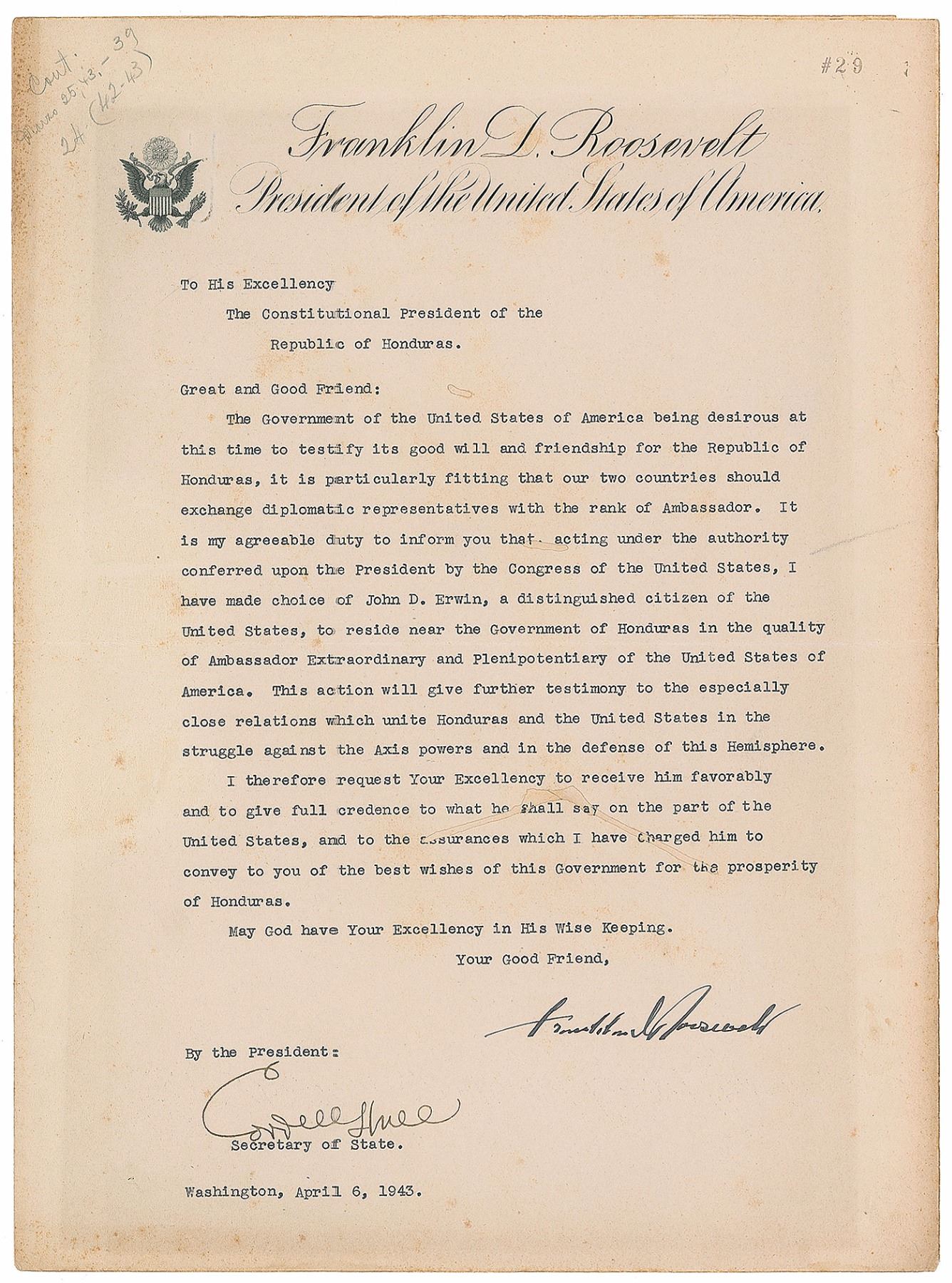 World War II-dated typed Letter of State, one page, 10.25 x 14, April 6, 1943. Official letter to President Carías Andino of Honduras, in full: "The Government of the United States of America being desirous at this time to testify its good will and friendship for the Republic of Honduras, it is particularly fitting that our two countries should exchange diplomatic representatives with the rank of Ambassador. It is my agreeable duty to inform you that, acting under the authority conferred upon the President by the Congress of the United States, I have made choice of John D. Erwin, a distinguished citizen of the United States, to reside near the Government of Honduras in the quality of Ambassador Extraordinary and Plenipotentiary of the United States of America. This action will give further testimony to the especially close relations which unite Honduras and the United States in the struggle against the Axis powers and in the defense of this Hemisphere. I therefore request Your Excellency to receive him favorably and to give full credence to what he shall say on the part of the United States, and to the assurances which I have charged him to convey to you of the best wishes of this Government for the prosperity of Honduras. May God have Your Excellency in His Wise Keeping." Signed at the conclusion by Roosevelt, and countersigned by Secretary of State Cordell Hull. In very good to fine condition, with a light block of toning, scattered foxing, and a few small repaired areas of paper loss.