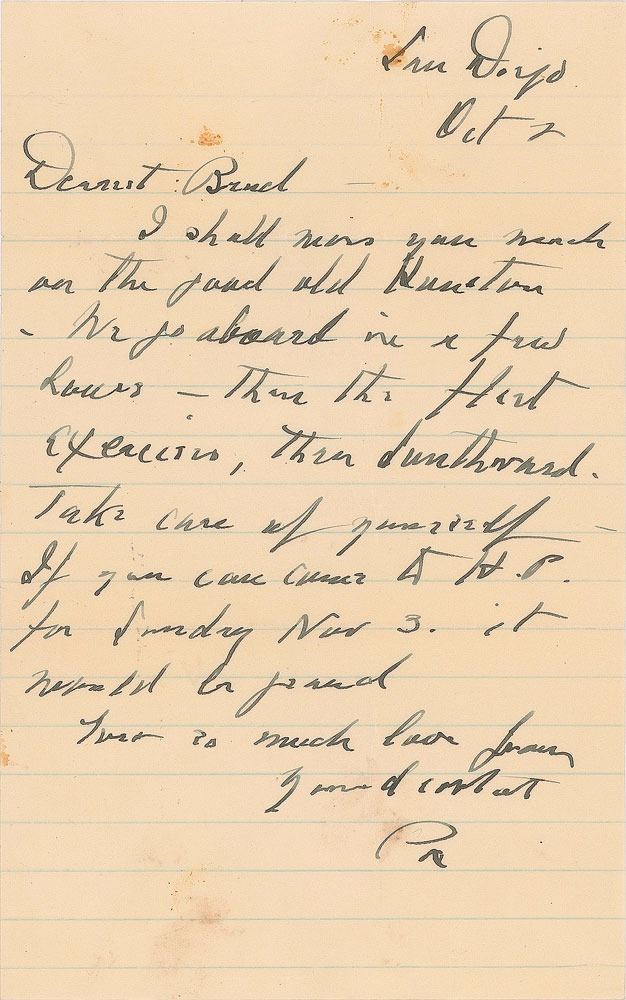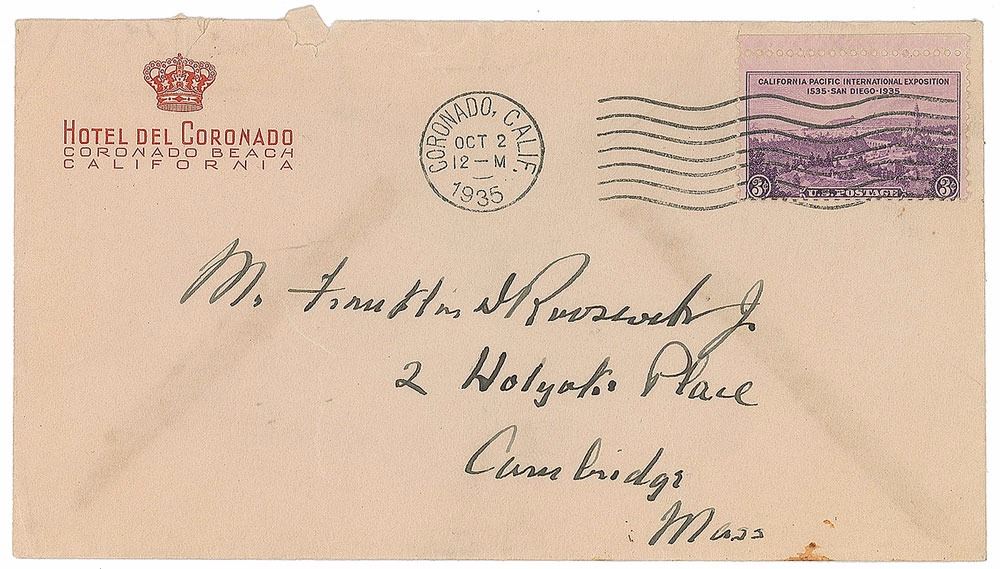 Uncommon ALS as president signed “Pa,” one page, lightly lined, 5 x 8, postmarked October 12, 1935. Written from the San Diego Naval Base, a letter to "Dearest Brud," his son Franklin D. Roosevelt, Jr., in full: "I shall miss you much on the good old Houston. We go aboard in a few hours—then the fleet exercises, then Southward. Take care of yourself. If you can come to H. P. for Sunday Nov 3. it would be grand." In fine condition, with a few light stains. Accompanied by the original Hotel del Coronado mailing envelope, addressed in Roosevelt's own hand: "M. Franklin D. Roosevelt, Jr., 2 Holyoke Place, Cambridge, Mass." In October 1935, Franklin and Eleanor Roosevelt stayed at the Hotel del Coronado for their appearance at San Diego’s California-Pacific International Exposition, the site where the president gave a speech to 50,000 people at Balboa Park. The date of this letter corresponds to the couple's embarkation aboard the USS Houston and FDR's subsequent review of of the Fleet's tactical drills and exercises.