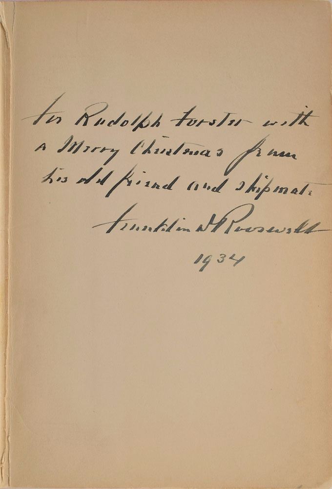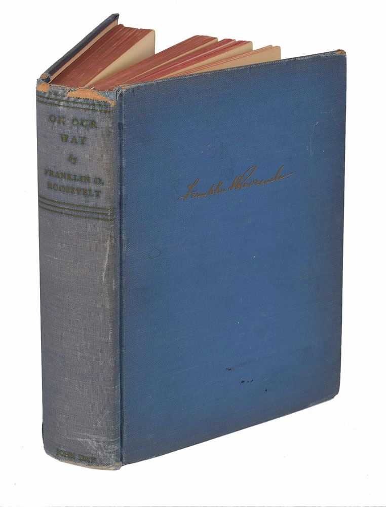 Signed book: On Our Way. First edition, first printing. NY: The John Day Company, 1934. Hardcover, 5.5 x 7.75, 300 pages. Signed and inscribed on the first free end page in fountain pen, "For Rudolph Forster, with a Merry Christmas from his old friend and shipmate, Franklin D. Roosevelt, 1934." Autographic condition: fine. Book condition: VG-/None, with cracked hinges, chipping to spine ends, and wear to spine; internal pages are clean and fresh. Roosevelt presented inscribed copies of this book—one of two published during his presidency—to roughly 100–150 members of the White House staff as Christmas gifts in 1934. Rudolph Forster was a longtime veteran, serving in the White House from March 5, 1897, until his death on July 7, 1943, at which time he was Executive Clerk in charge of the White House staff. A wonderful association copy inscribed to a man who served in eight presidential administrations.