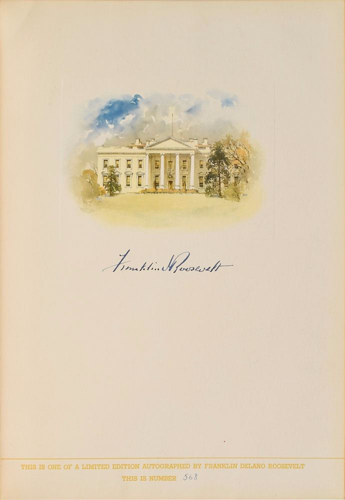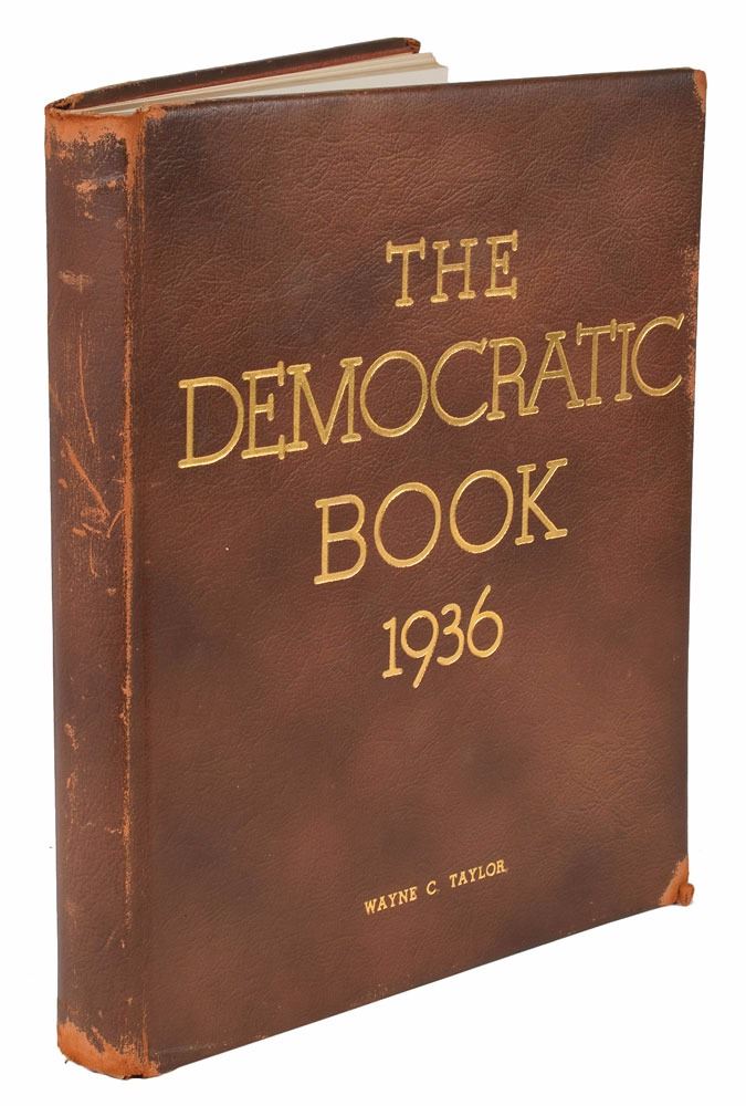 Signed book: The Democratic Book, 1936. Limited edition, numbered 568 of an unspecified limitation. Gilt-stamped leatherbound hardcover, 11.5 x 14.5, 384 pages. Signed on the beautifully designed colophon in fountain pen by Roosevelt below a watercolor vignette of the White House. The original owner’s name, “Wayne C. Taylor,” is also stamped on the cover. Autographic condition: very fine. Book condition: VG-/None, with significant scuffing to the leather covers with some losses at corners. A lavishly produced promotional ‘year book’ for the Democratic Party, this volume contains features on accomplishments by Democrats, images of FDR’s cabinet, and ads. The selling of advertising space—and the selling of the book itself to corporations, at $250 per copy—aroused much controversy at the time, and objections were raised that these de facto corporate contributions violated the Corrupt Practices Act which prohibited corporations from contributing to national campaigns. An impressive and substantial book with a gorgeous signed page.