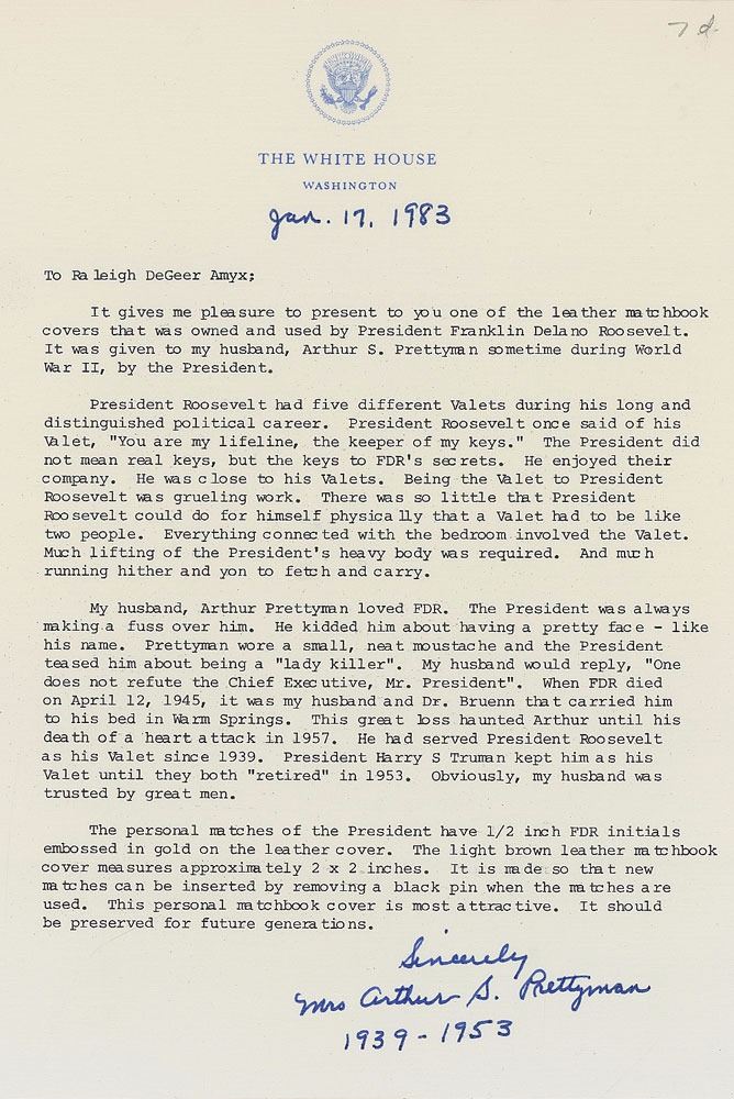 President Roosevelt’s personally-owned and -used fine quality brown leather matchbook, measuring 2 x 2.25 closed, featuring his gilt-embossed initials on the front flap, “FDR.” The matchbook is fully stocked with 15 matches and features a small black fastener at the bottom, allowing the matches to be replaced—a function of FDR’s valet. Includes a detailed letter of provenance on White House letterhead from the wife of Arthur S. Prettyman, who had served as Roosevelt’s valet from 1939 until his death in 1945, and continued to work for President Truman, as his personal valet, until he left office, in 1953. In brief part: "President Roosevelt once said of his Valet, 'You are my lifeline, the keeper of my keys'…the keys to FDR's secrets," and, in part: "It gives me pleasure to present to you one of the leather matchbook covers that was owned and used by President Franklin Delano Roosevelt. It was given to my husband, Arthur S. Prettyman sometime during World War II, by the President…The personal matches of the President have 1/2 inch FDR initials embossed in gold on the leather cover…This personal matchbook cover is most attractive." A cogent piece of FDR history—a necessity for the lifelong cigarette smoker. From the Raleigh DeGeer Amyx Collection.