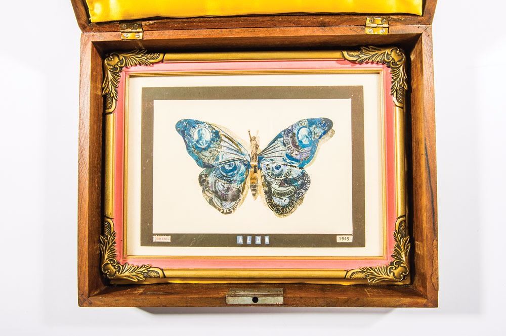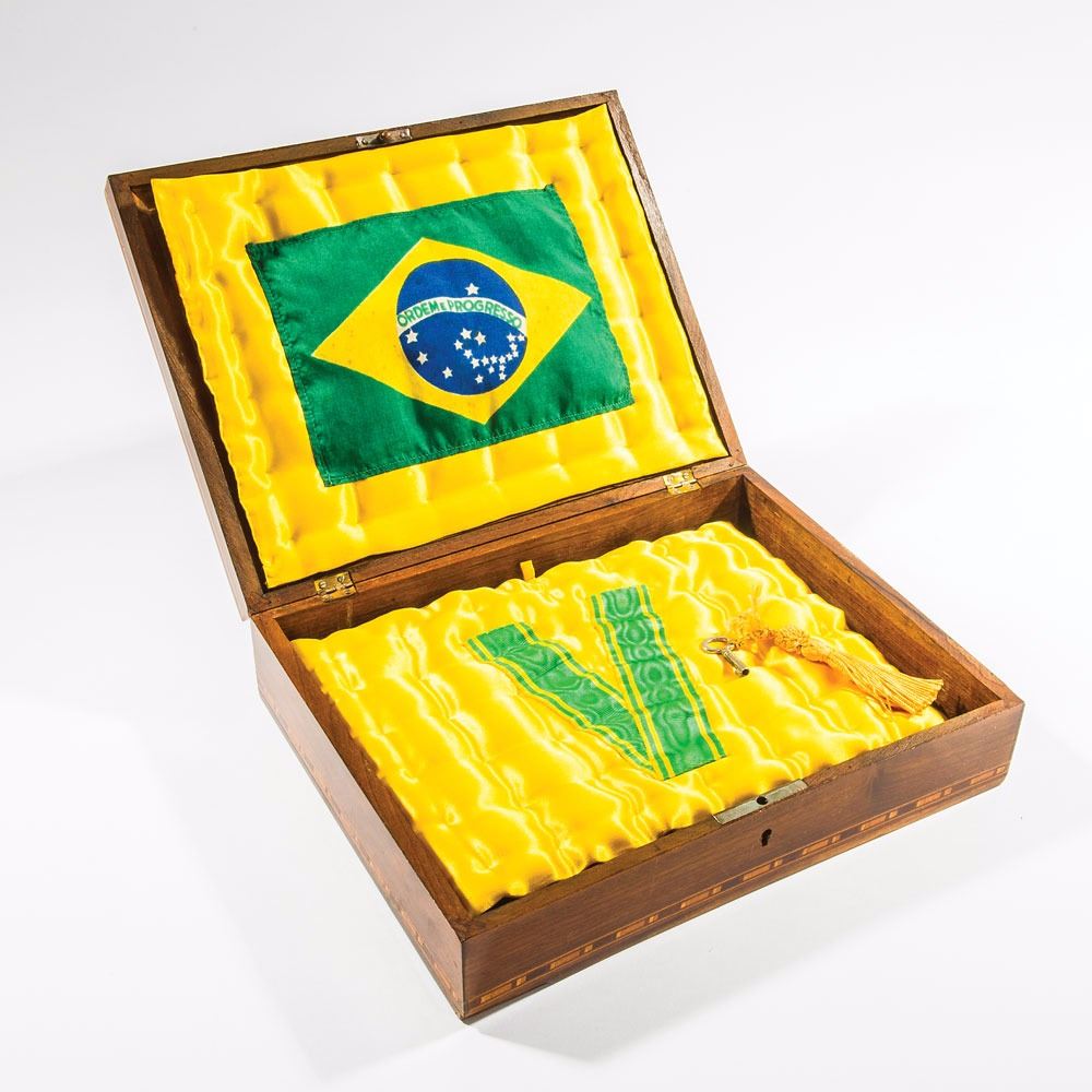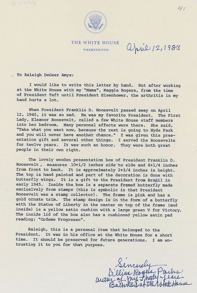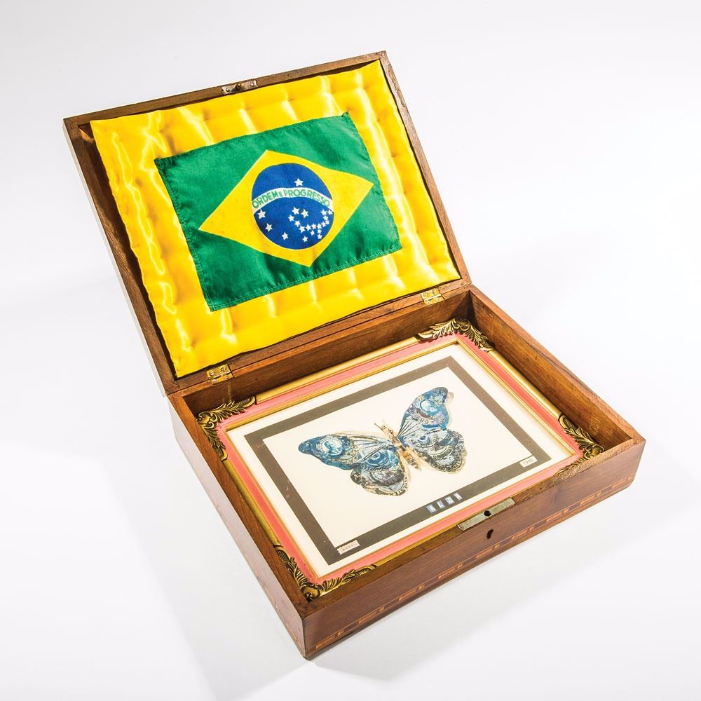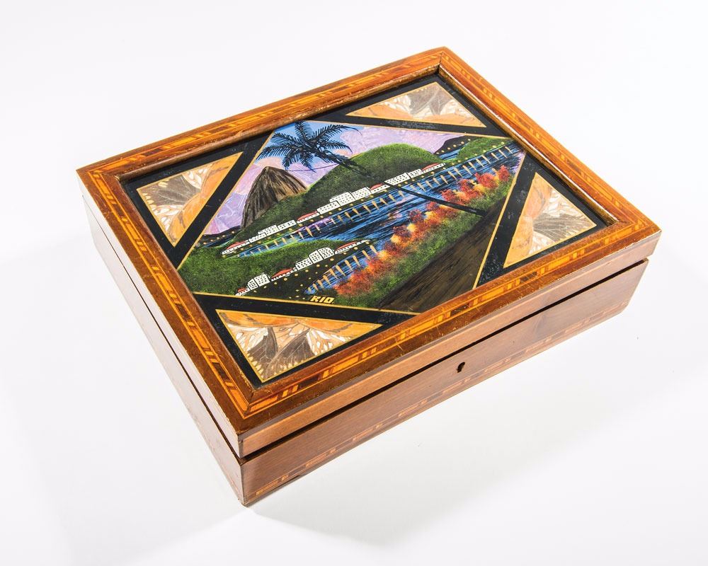 President Roosevelt’s magnificent personally-owned decorative presentation box given to him as a gift from Brazil in 1945, measuring 10.5 x 8.25 x 2.75, featuring amazing mixed-media artwork beneath the glass cover depicting an oceanfront Brazilian city, accomplished using paint and actual butterfly wings, a very hands-on art format. The box itself also has an intricate inlaid design on the cover’s borders and the bottom edge. The top cover is lined with padded yellow cloth bearing a Brazilian flag, with similar padding lining the bottom. A loose yellow pad provides extra protection and bears a large green "V" for 'victory.' Housed inside is a spectacular piece of original artwork depicting a butterfly, made entirely by hand out of postage stamps to acknowledge the president’s hobby; this is presented in an ornate frame, portions of which have been repaired to secure the embellishments in the corners. Includes a detailed letter of provenance on White House letterhead from Lillian Rogers Parks, who was a housekeeper and seamstress at the White House for over 30 years, from President Hoover through President Eisenhower. In part: “The lovely wooden presentation box of President Franklin D. Roosevelt…is hand painted and part of the decoration is done with butterfly wings. It is a gift to the President from Brazil in early 1945. Inside the box is a separate framed butterfly made exclusively from stamps (this is symbolic in that President Roosevelt was a stamp collector)…The stamp design is in the form of a butterfly with the Statue of Liberty in the center on top of the frame…This is a personal item that belonged to the President. It was in his office at the White House for a short time. It should be preserved for future generations." A visually imposing, first-class FDR relic. From the Raleigh DeGeer Amyx Collection.