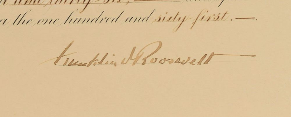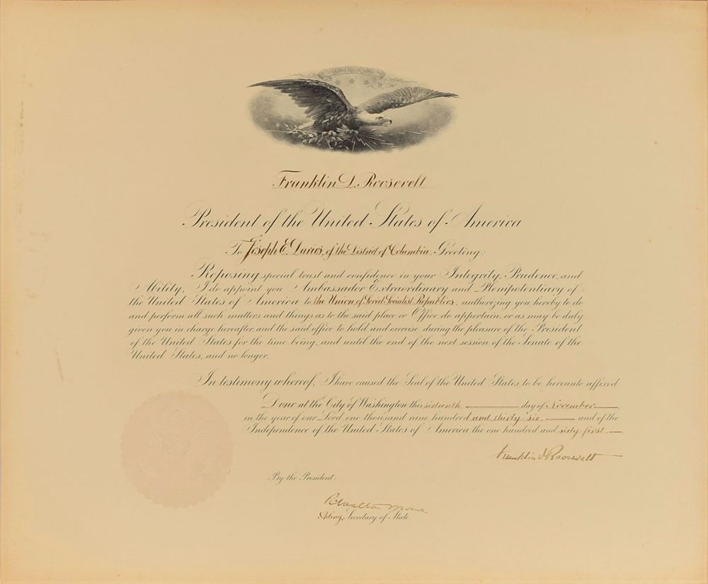 Partly-printed DS as president, one page, 23 x 19, November 16, 1936. President Roosevelt appoints Joseph E. Davis of the District of Columbia as "Ambassador Extraordinary and Plenipotentiary of the United States of America to the Union of Soviet Socialist Republics." Signed at the conclusion by Roosevelt, and countersigned by Acting Secretary of State Robert Walton Moore. Large presidential seal affixed to lower left. In fine condition, with a bit of light staining along the left edge.