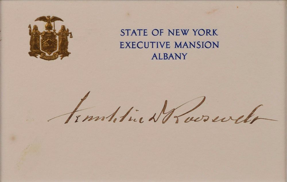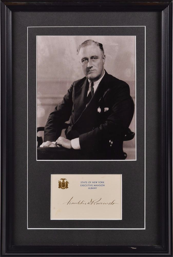 Fountain pen signature, "Franklin D. Roosevelt," on an off-white State of New York, Executive Mansion, Albany card. Double-matted and framed with a portrait of FDR to an overall size of 12 .25 x 18.25. In fine condition with a couple of areas of light soiling to the card, not touching the clear, bold signature. Accompanied by the original mailing envelope for the autograph, postmarked Albany, NY, February 25, 1930.