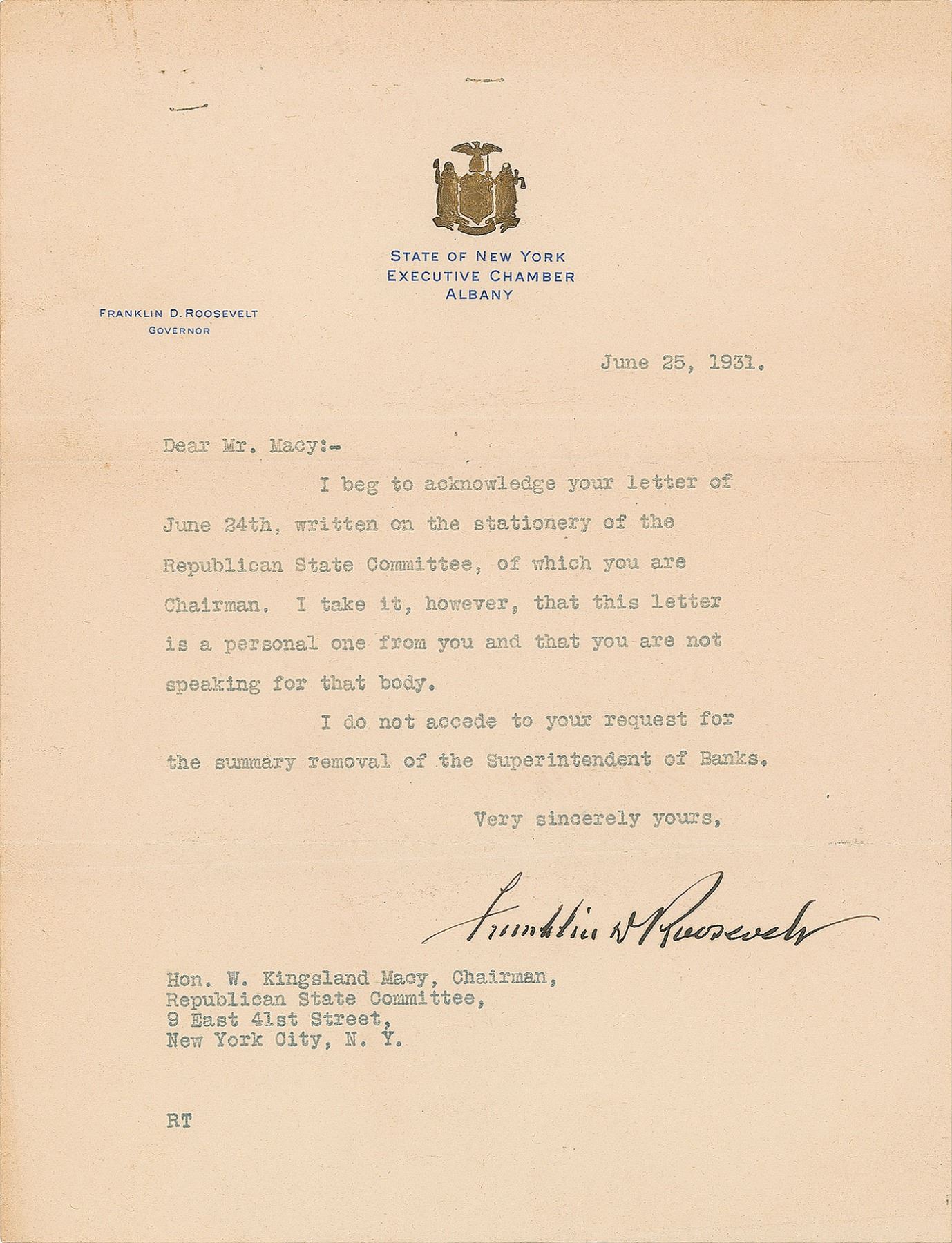 TLS, one page, 8 x 10.5, State of New York, Executive Chamber letterhead, June 25, 1931. Letter to W. Kingsland Macy of the Republican State Committee, in full: "I beg to acknowledge your letter of June 24th, written on the stationery of the Republican State Committee, of which you are Chairman. I take it, however, that this letter is a personal one from you and that you are not speaking for that body. I do not accede to your request for the summary removal of the Superintendent of Banks." In fine condition, with small staple holes at the top. Accompanied by the original mailing envelope.