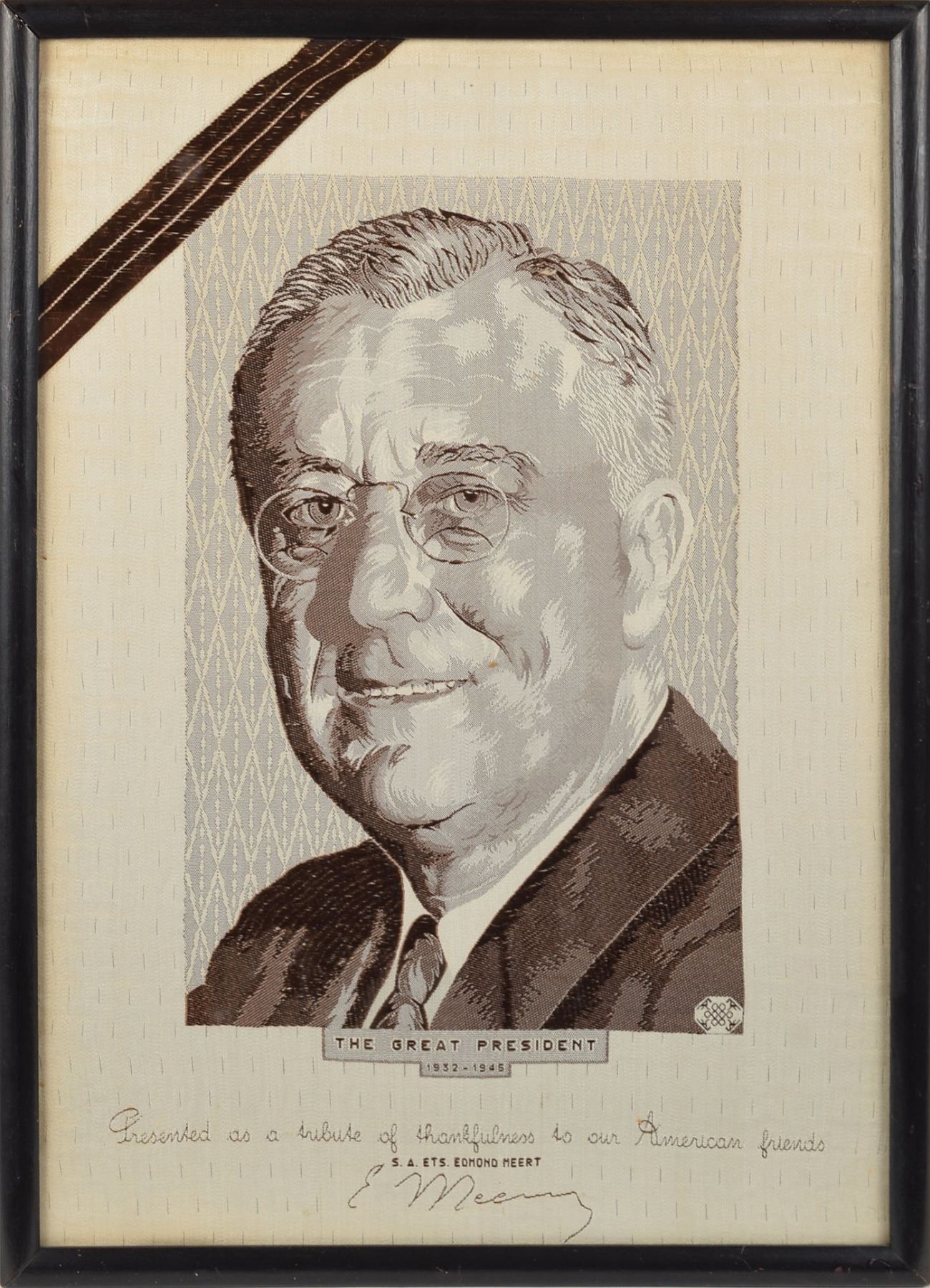 Uncommon embroidered portrait of President Franklin D. Roosevelt by Belgian textile manufacturer Edmond Meert, 10.75 x 15.25, issued on the occasion of the liberation of Belgium in 1945, with black band to upper left corner signifying the year of FDR’s death. The lower border features an embroidered inscription: “Presented as a tribute of thankfulness to our American friends.” Framed and in fine condition. The same embroidered portrait is hanging on the walls of the FDR Library in Hyde Park, New York.