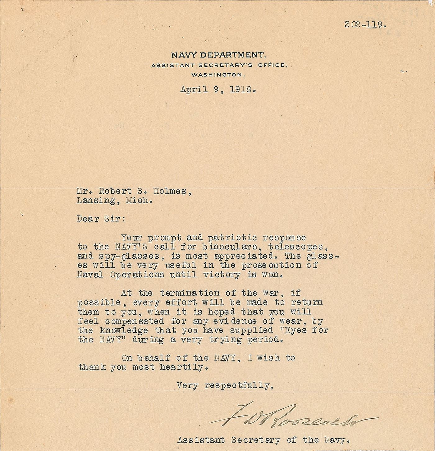 TLS signed “F. D. Roosevelt,” one page, trimmed to a size of 8 x 8, Navy Department letterhead, April 9, 1918. Letter written as assistant secretary of the Navy, in part: "Your prompt and patriotic response to the Navy's call for binoculars, telescopes, and spy-glasses, is most appreciated. The glasses will be very useful in the prosecution of Naval Operations until victory is won. At the termination of the war, if possible, every effort will be made to return them to you, when it is hoped that you will feel compensated for any evidence of wear, by the knowledge that you have supplied 'Eyes for the Navy' during a very trying period." In fine condition.