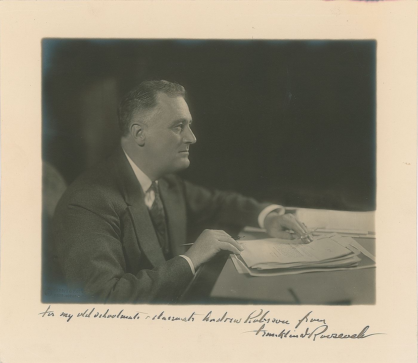 Handsome matte-finish 11.5 x 10 Harris & Ewing portrait of President Roosevelt at his desk, boldly signed and inscribed in the lower border in fountain pen, "For my old schoolmate & classmate Andrew Robeson from, Franklin D. Roosevelt.” Blindstamped in the lower left of the image by Harris & Ewing. In very good to fine condition, with creasing to the wide borders, and slight silvering to the image.