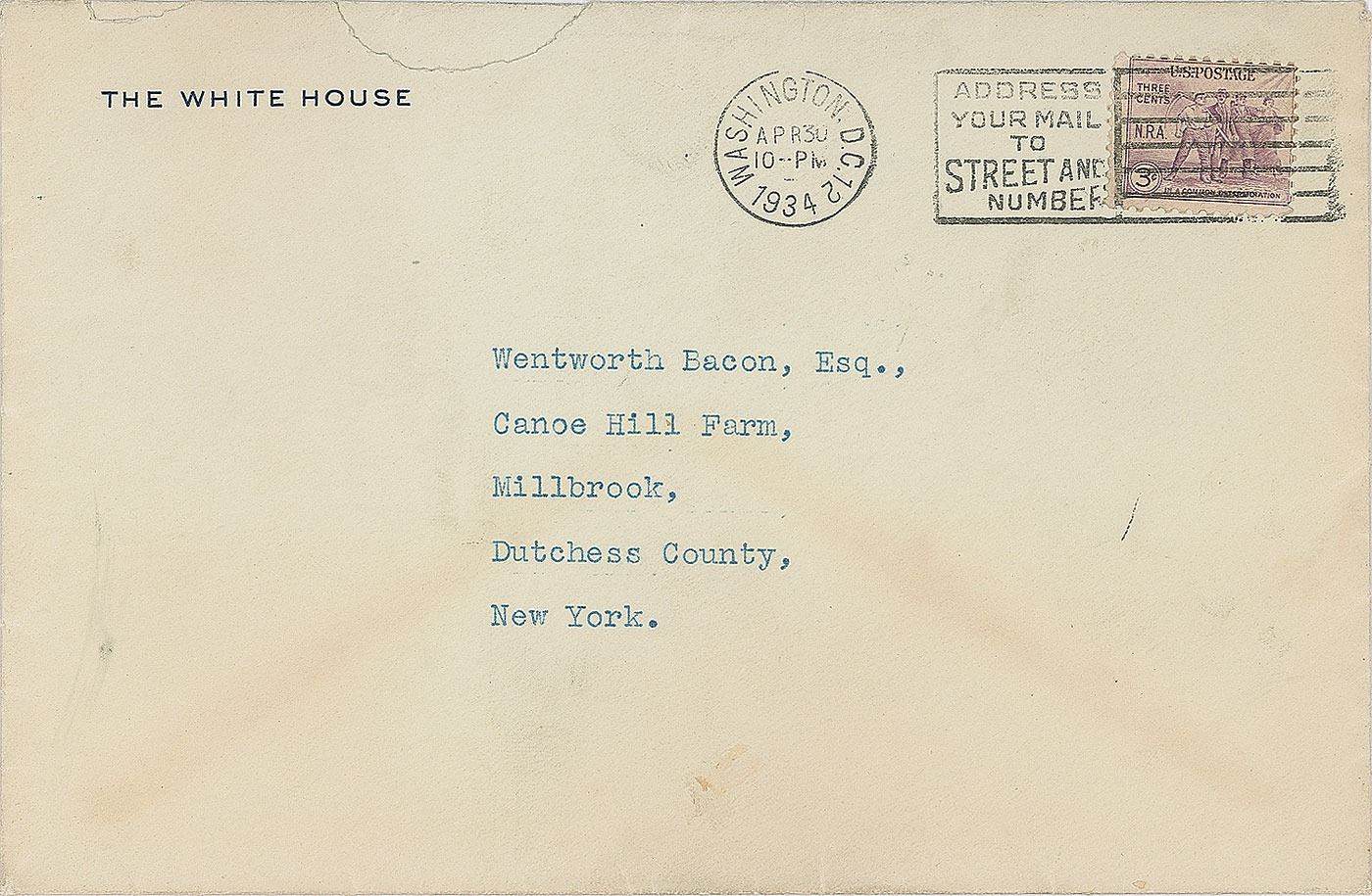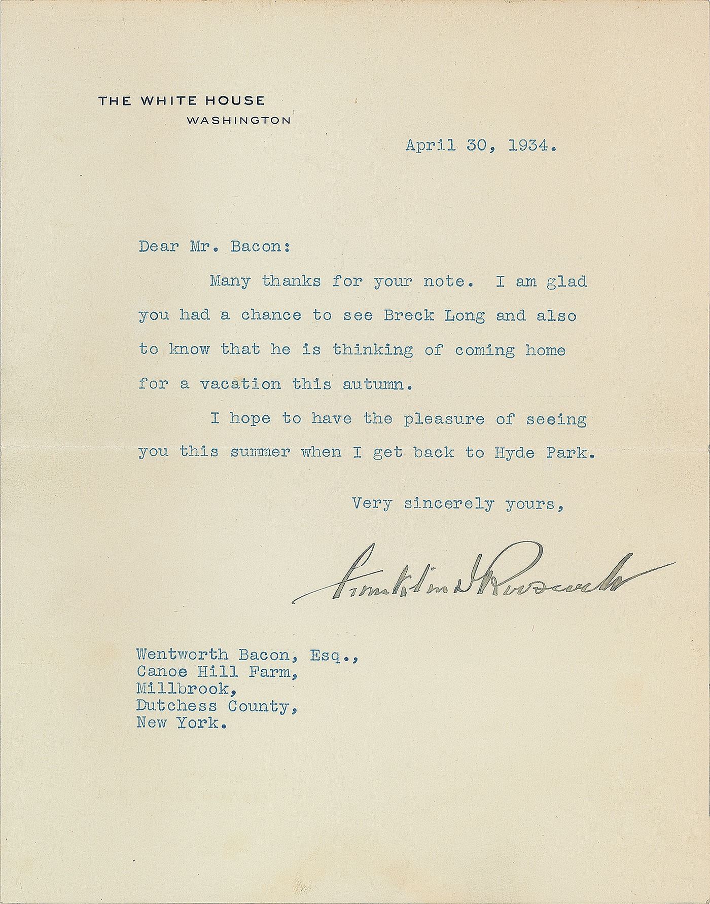 TLS as president, one page, 7 x 8.75, White House letterhead, April 30, 1934. Letter to Wentworth Bacon of Canoe Hill Farm in Millbrook, New York, in full: "Many thanks for your note. I am glad you had a chance to see Breck Long and also to know that he is thinking of coming home for a vacation this autumn. I hope to have the pleasure of seeing you this summer when I get back to Hyde Park." In fine condition. Accompanied by the original mailing envelope. The recipient, Wentworth Bacon, was a Dutchess County neighbor and acquaintance of FDR.