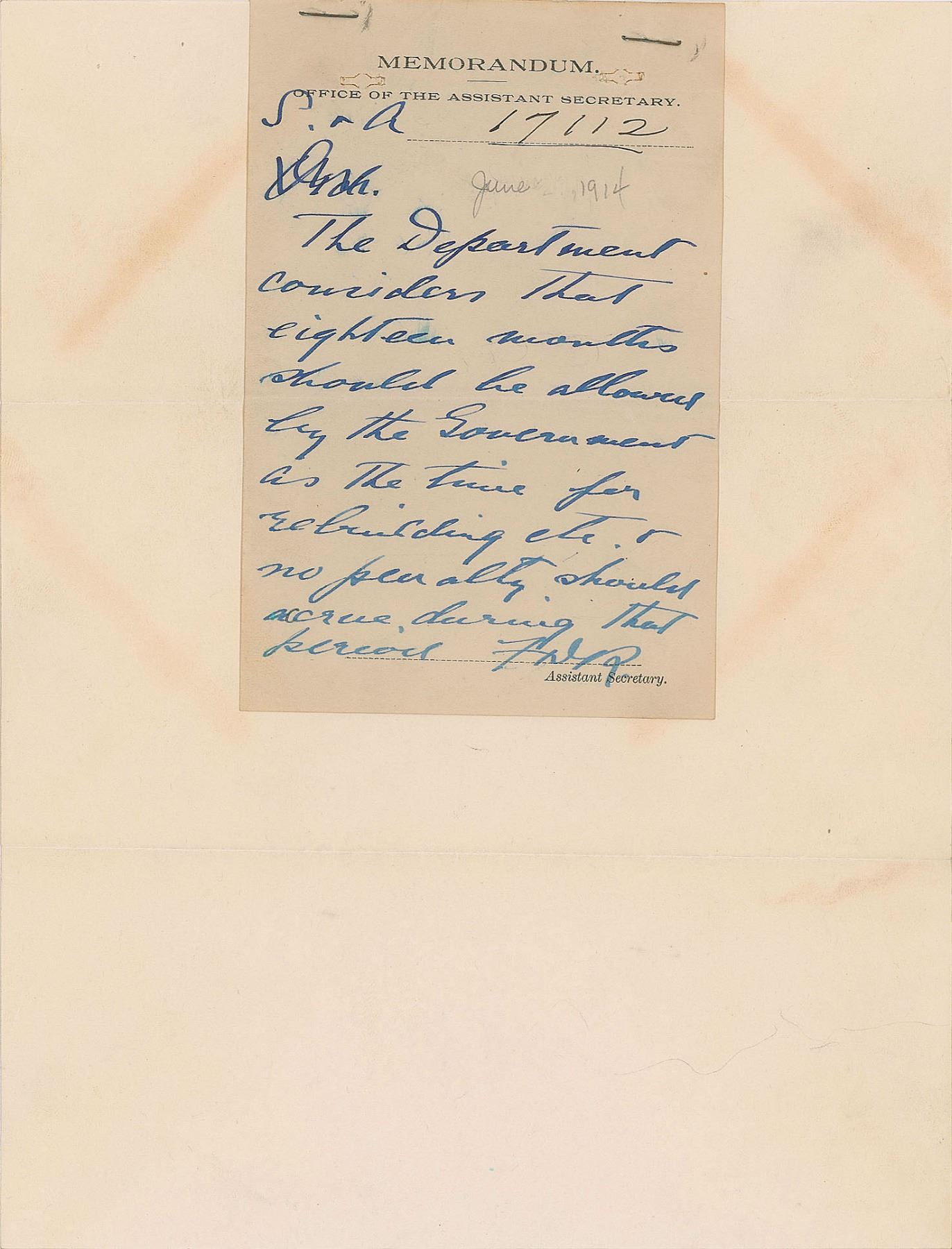 ANS signed “FDR,” one page, 4 x 6, June 1914. Handwritten dictation by Roosevelt as Assistant Secretary of the Navy, in full: "S & A, The department considers that eighteen months should be allowed by the Government as the time for rebuilding etc. & no penalty should accrue during that period." Includes a typed letter from J. C. Wylie, dated January 5, 1947, forwarding the Roosevelt memo to his son, in part: "In clearing up a desk I find an endorsement by the Assistant Secretary of Navy to the Bureau of Supplies and Accounts on F. H. Lovell & Co. Contract No. 17112 dated June, 1911 and a longhand endorsement signed by F.D.R., Assistant Secretary. This endorsement was written from my dictation between June 25th and 30th in 1914, and in 1935, remembering the circumstances very well, I asked the President of the United States if he would be good enough to send me this memorandum since it was a government record over 20 years old and explained that few men in my humble station have had the distinction of dictating to the President of the United States." The Roosevelt memo is stapled to a larger sheet. In fine condition. Accompanied by the transmittal letter from President Roosevelt's secretary, M. A. LeHand, dated June 18, 1935, relaying the memo to Wylie.