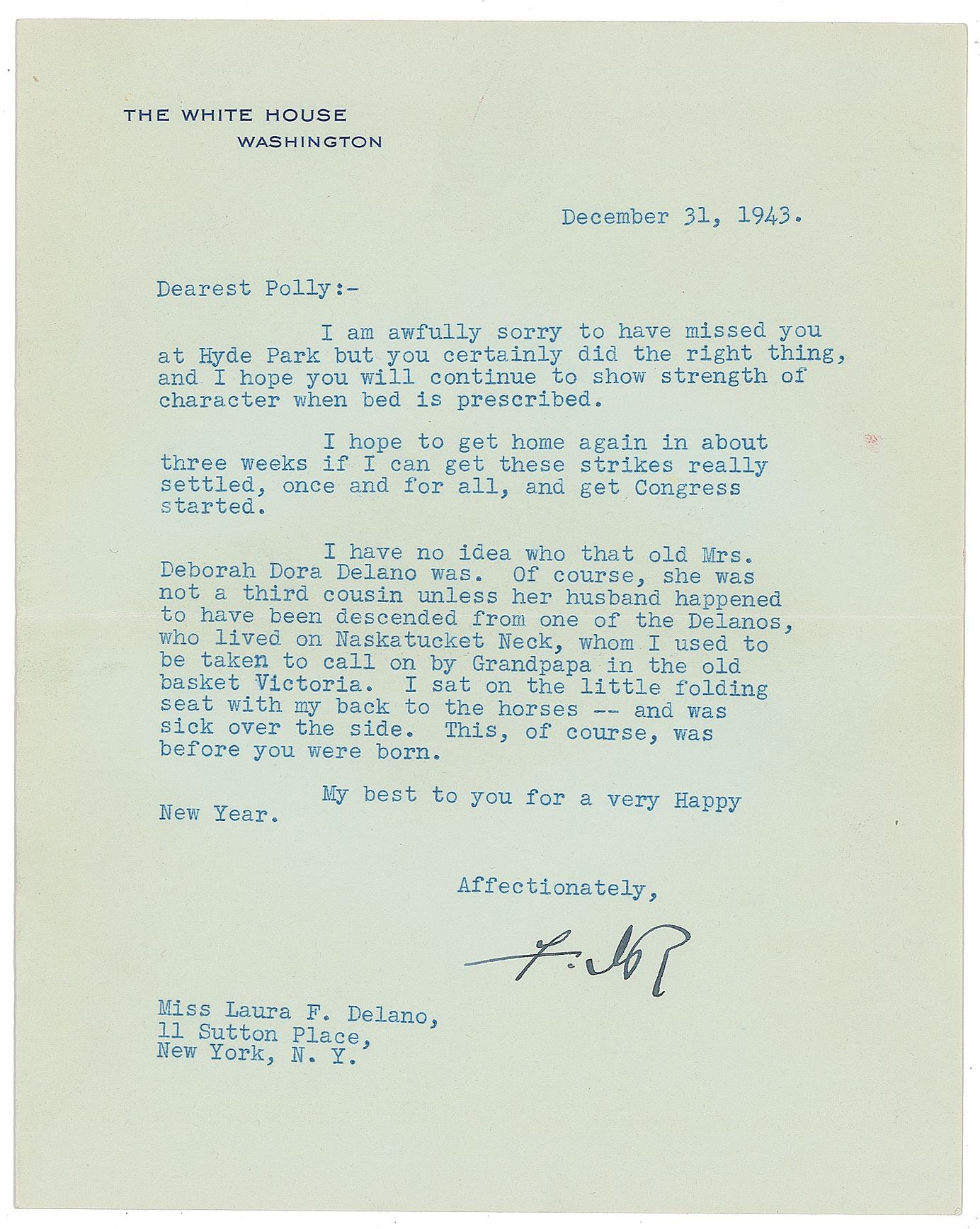 TLS as president signed “FDR,” one page, 7 x 8.75, White House letterhead, December 31, 1943. Letter to "Polly," his favorite cousin Laura Franklin Delano, in full: "I am awfully sorry to have missed you at Hyde Park but you certainly did the right thing, and I hope you will continue to show strength of character when bed is prescribed. I hope to get home again in about three weeks if I can get these strikes really settled, once and for all, and get Congress started. I have no idea who that old Mrs. Deborah Dora Delano was. Of course, she was not a third cousin unless her husband happened to have been descended from one of the Delanos, who lived on Naskatucket Neck, whom I used to be taken to call on by Grandpapa in the old basket Victoria. I sat on the little folding seat with my back to the horses—and was sick over the side. This, of course, was before you were born. My best to you for a very Happy New Year." In fine condition. Accompanied by the original mailing envelope.