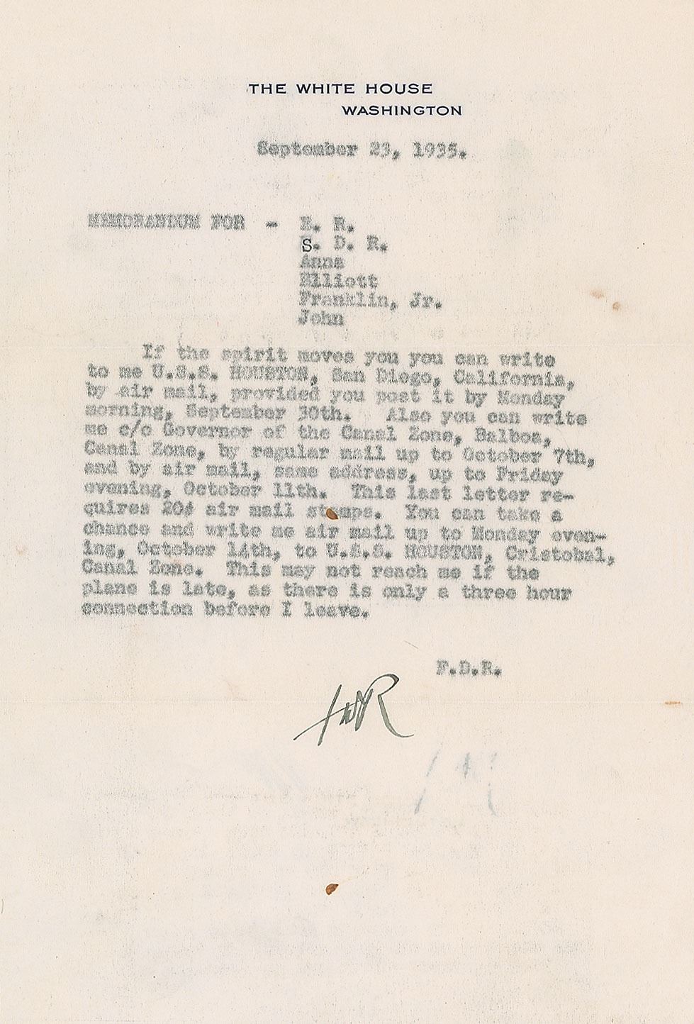 TLS as president signed “F.D.R.,” one page, 6.25 x 9.25, White House letterhead, September 23, 1935. A carbon copy memo to his family, "E. R., S. D. R., Anna, Elliott, Franklin, Jr., John," in full: "If the spirit moves you you can write to me U.S.S. Houston, San Diego, California, by air mail, provided you post it by Monday morning, September 30th. Also you can write me c/o Governor of the Canal Zone, Balboa, Canal Zone, by regular mail up to October 7th, and by air mail, same address, up to Friday evening, October 11th. This last letter requires 20¢ air mail stamps. You can take a chance and write me air mail up to Monday evening, October 14th, to U.S.S. Houston, Cristobal, Canal Zone. This may not reach me if the plane is late, as there is only a three hour connection before I leave." In fine condition, with a couple of small brown stains.