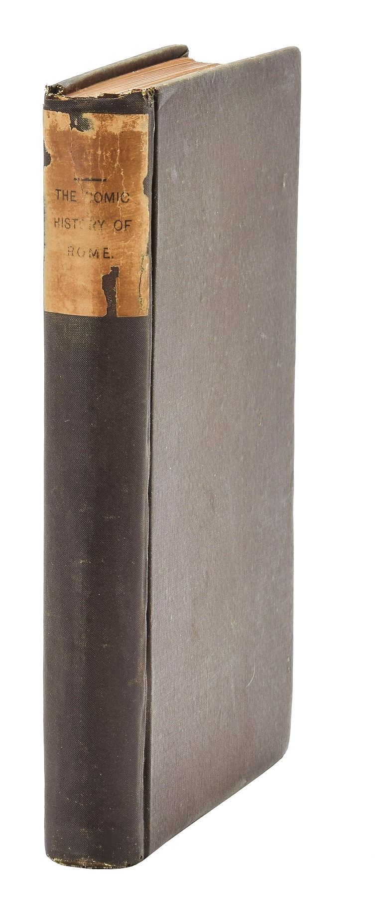 Desirable signed book: The Comic History of Rome. Later edition. London: Bradbury, Agnew & Co., circa 1860. Hardcover with custom leather-bound slipcase, 6 x 8.75, 308 pages, with 10 full-page comic plates by John Leech. Signed on an opening page in black ink by Franklin D. Roosevelt, "Franklin & Eleanor Roosevelt, 1905, from Elliott Roosevelt's Library," noting it as being from the library of Eleanor Roosevelt's father, Elliott Roosevelt (1860–1894); and signed again below by FDR, during his third term as president, with a gift inscription to their son and a namesake of the original owner, "For Elliott Roosevelt, from Mother & Father, March 1943." Autographic condition: fine, with a couple of small edge chips to signed page. Book condition: VG/None, with a tear to the hand-colored frontispiece, sunning and wear to the paper spine label, and fraying to spine ends. Accompanied by a catalog from James Cummins Bookseller of New York. From the estate of noted FDR collector Donald Carmichael, whose ownership bookplate is affixed to the inside of the slipcase.
