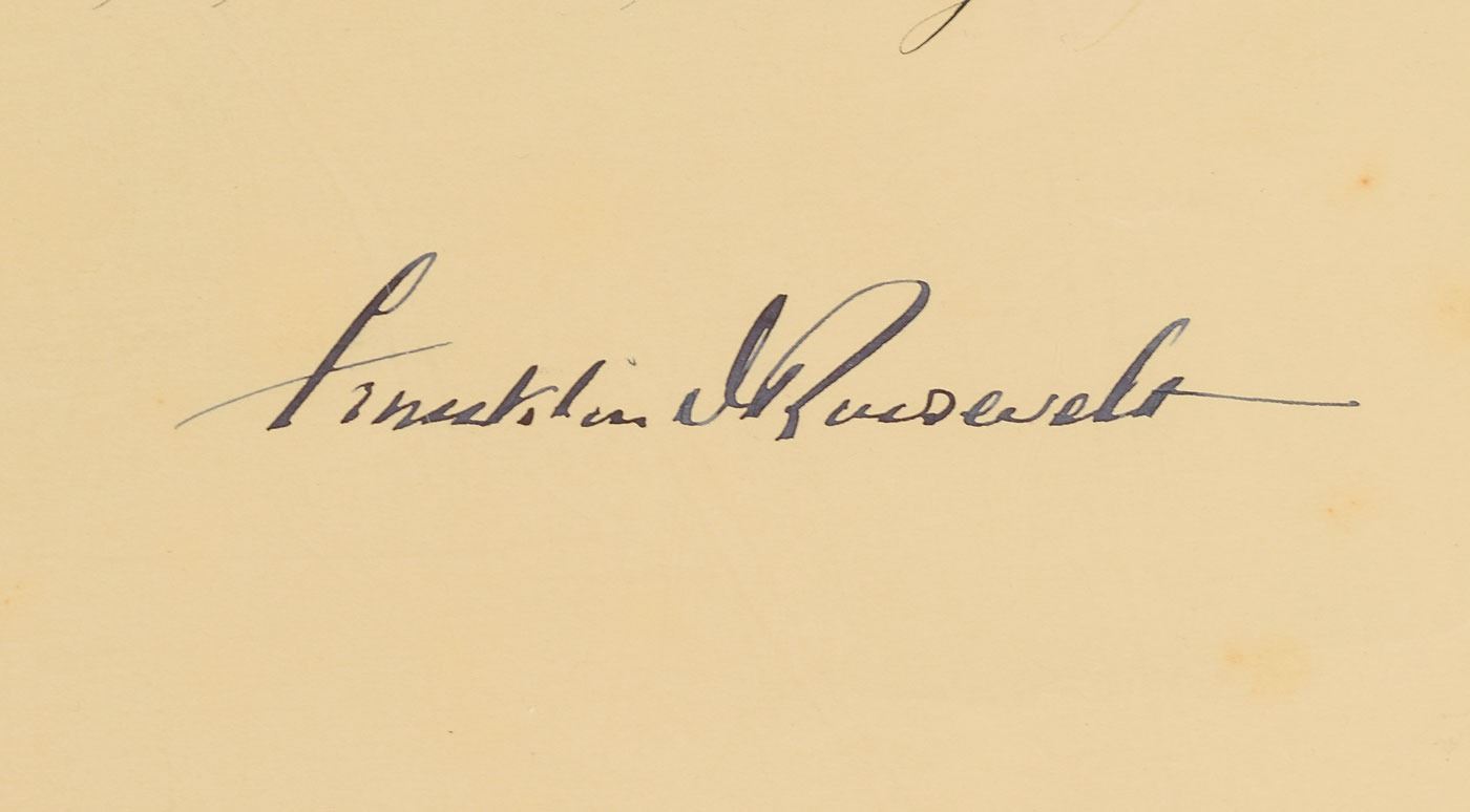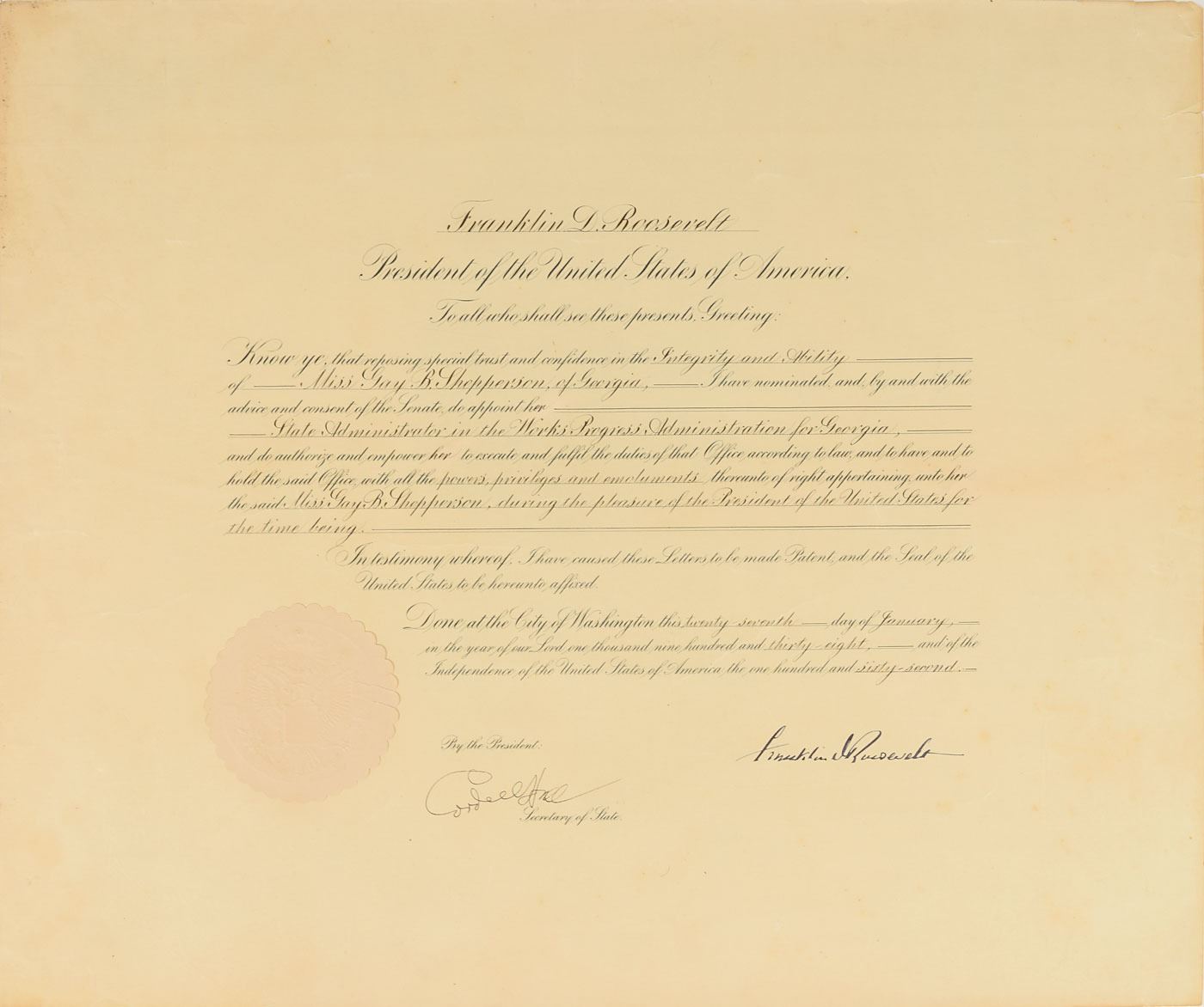 Partly-printed DS as president, one page, 22.75 x 18.75, January 27, 1938. President Roosevelt appoints Miss Gay B. Shepperson as "State Administrator in the Works Progress Administration for Georgia." Boldly signed at the conclusion by President Roosevelt and countersigned by Secretary of State Cordell Hull. The large white paper seal affixed to the lower left remains fully intact. In fine condition, with scattered light foxing, and a few short edge tears.