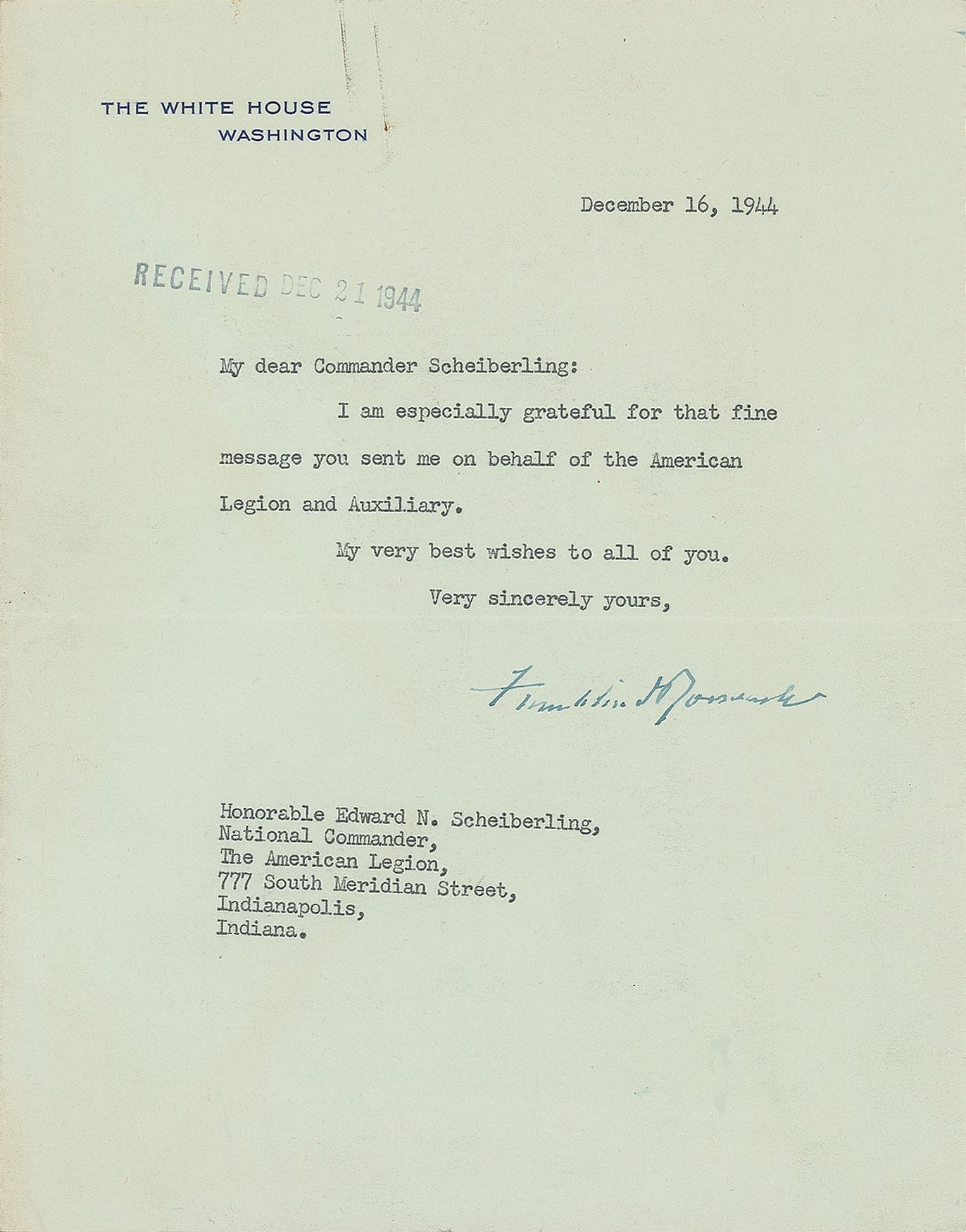 World War II-dated TLS as president, one page, 7 x 8.75, White House letterhead, December 16, 1944. Letter to Edward N. Scheirberling, the National Commander of the American Legion, in full: "I am especially grateful for that fine message you sent me on behalf of the American Legion and Auxiliary. My very best wishes to all of you." In fine condition, with a paperclip impression to the top edge. Accompanied by the original mailing envelope.