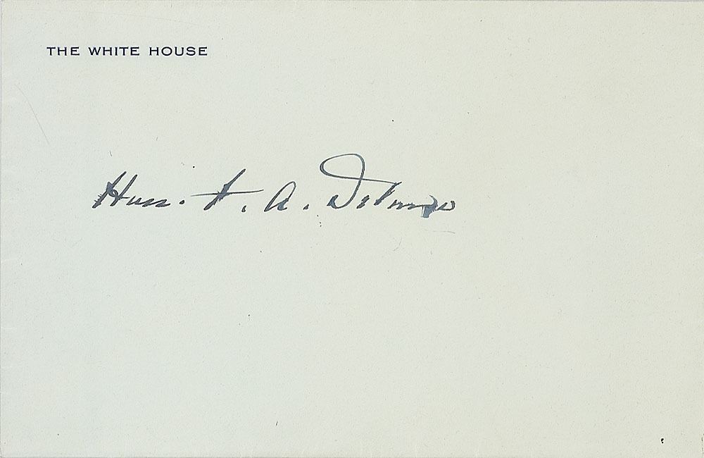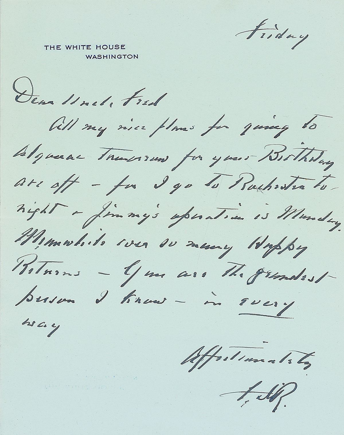 Scarce ALS as president signed “F. D. R.,” one page, 7 x 9, White House letterhead, [September 9, 1938]. Letter to "Uncle Fred," his mother's brother Frederic Delano. In full: "All my nice plans for going to Algonac tomorrow for your Birthday are off—for I go to Rochester tonight & Jimmy's operation is Monday. Meanwhile ever so many Happy Returns—You are the grandest person I know—in every way." In fine condition. Accompanied by the original White House transmittal envelope addressed in FDR's own hand "Hon. F. A. Delano."