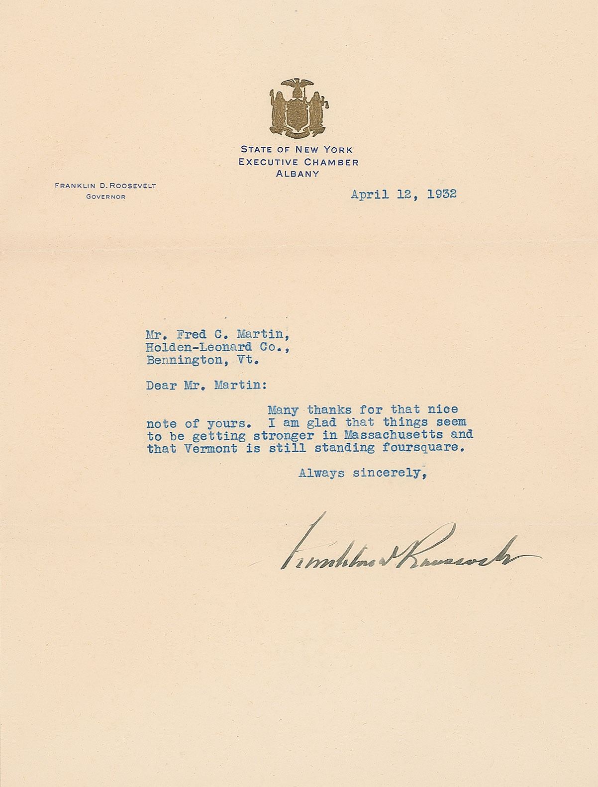 TLS, one page, 8 x 10.5, State of New York Executive Chamber letterhead, April 12, 1932. Letter to Fred C. Martin, in full: "Many thanks for that nice note of yours. I am glad that things seem to be getting stronger in Massachusetts and that Vermont is still standing foursquare." In fine condition. Accompanied by the original mailing envelope.