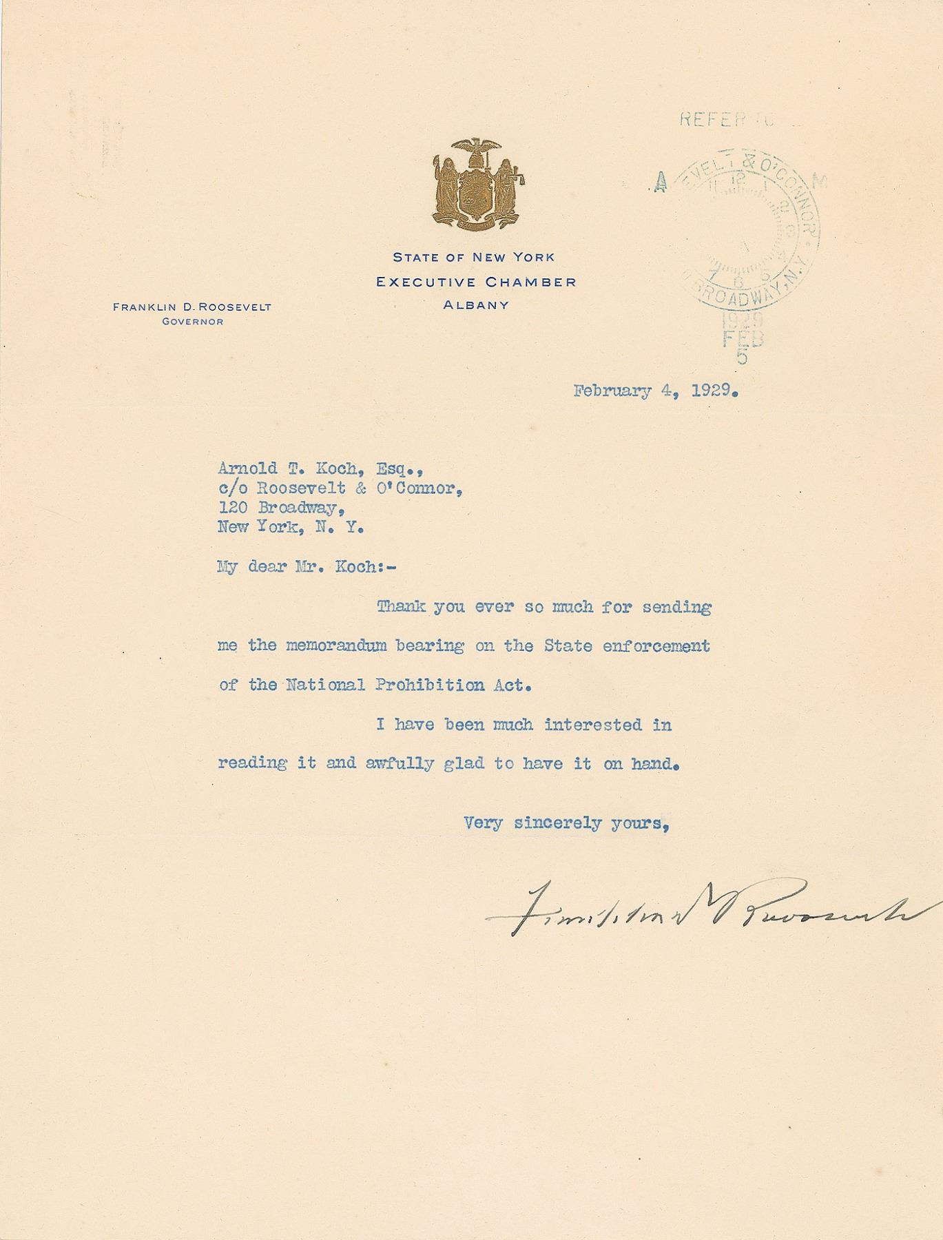 TLS as governor, one page, 8 x 10.5, State of New York, Executive Chamber letterhead, February 4, 1929. Letter to Arnold T. Koch of the firm Roosevelt & O'Connor, in full: "Thank you ever so much for sending me the memorandum bearing on the State enforcement of the National Prohibition Act. I have been much interested in reading it and awfully glad to have it on hand." In fine condition. Some four years later, on March 22, 1933, President Roosevelt, holding fast to his promise to repeal the 18th Amendment, signed into law a measure amending the Volstead Act, which had ushered in more than a decade of Prohibition in the United States.