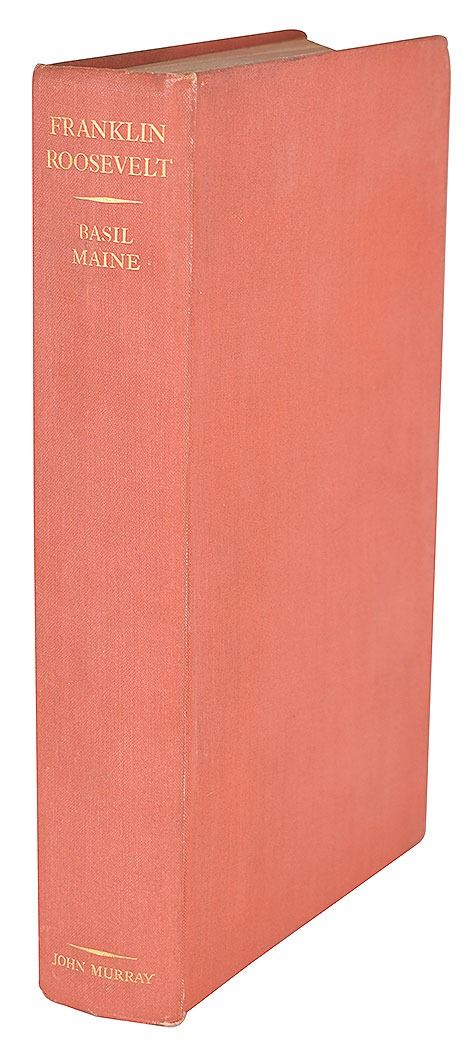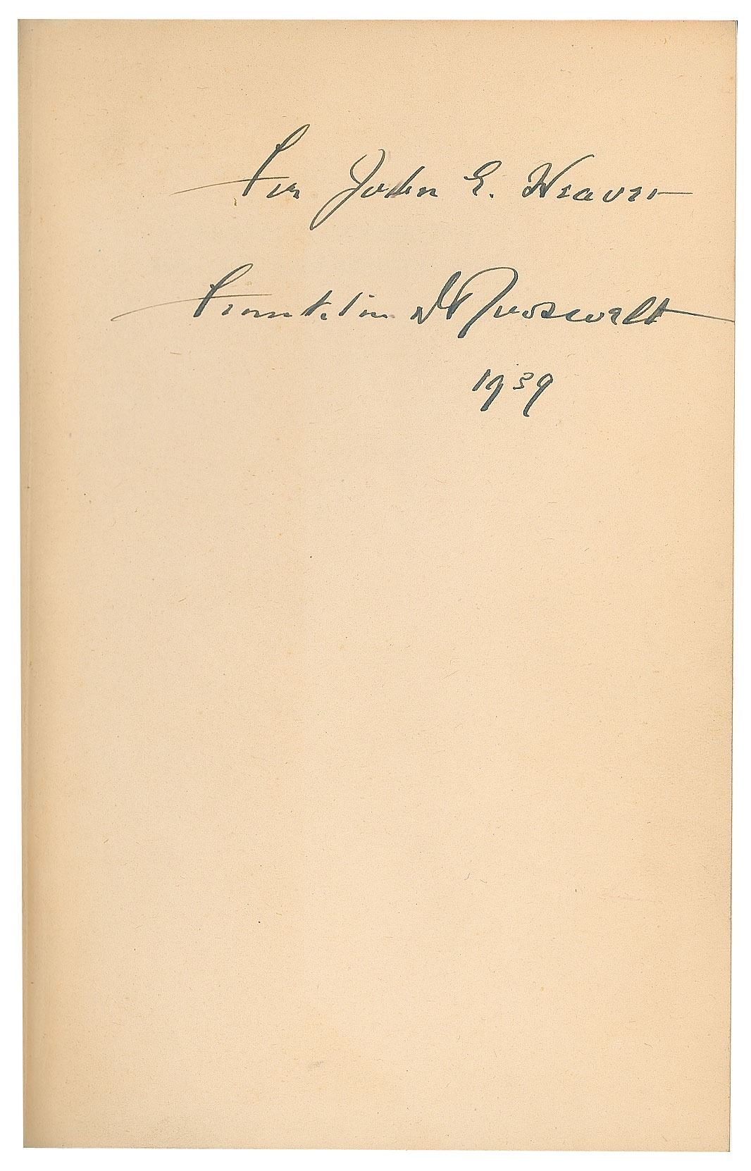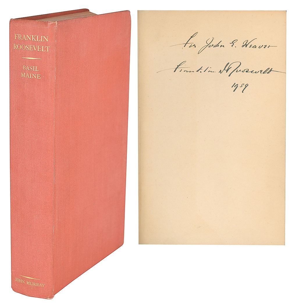 Signed book: Franklin D. Roosevelt: His Life and Achievement. First edition. London: John Murray, 1938. Hardcover, 5.75 x 8.75, 286 pages. Signed and inscribed on the first free end page in fountain pen as president, "For John E. Weaver, Franklin D. Roosevelt, 1939." Autographic condition: fine. Book condition: VG/None, with bumped corners and a "Library of Lawrence E. Miller" blindstamp to a rear page.