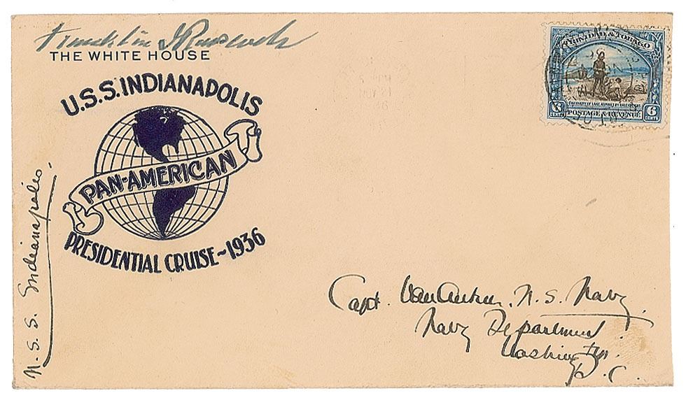 White House commemorative cover with a cachet honoring the USS Indianapolis Pan-American Presidential Cruise in 1936, signed along the top left edge, “Franklin D. Roosevelt.” Envelope bears a vertical notation, “USS Indianapolis,” along the left edge, and is addressed in another hand to US Navy Captain William R. Van Auku. In fine condition. President Roosevelt boarded the USS Indianapolis—his personal 'Ship of State'—on November 18, 1936, for a “Good Neighbor Tour” cruise to South America, including the Pan American Conference in Buenos Aires. The trip marked the first time that a sitting president had visited outside North America. The USS Indianapolis was later sunk by the Japanese after two torpedo hits on the night of July 30, 1945. Out of the crew of 900 who survived the sinking, only 316 survived the shark-infested Pacific waters. It was the worst loss of life in the history of the United States Navy.