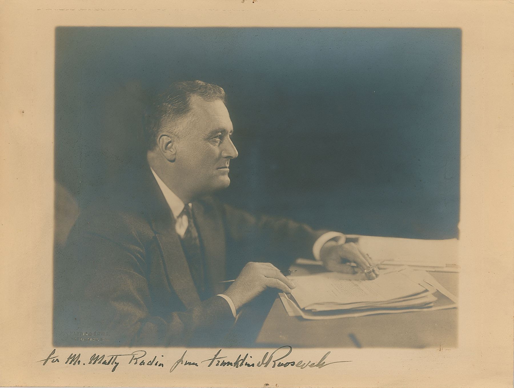 Classic matte-finish 12 x 9 photo of FDR at his desk by Harris & Ewing, signed and inscribed in the lower border in fountain pen, "For Mr. Matty Radin, from Franklin D. Roosevelt.” Affixed to a same-size mount and in fine condition, with trimmed edges and some curling to the mount.