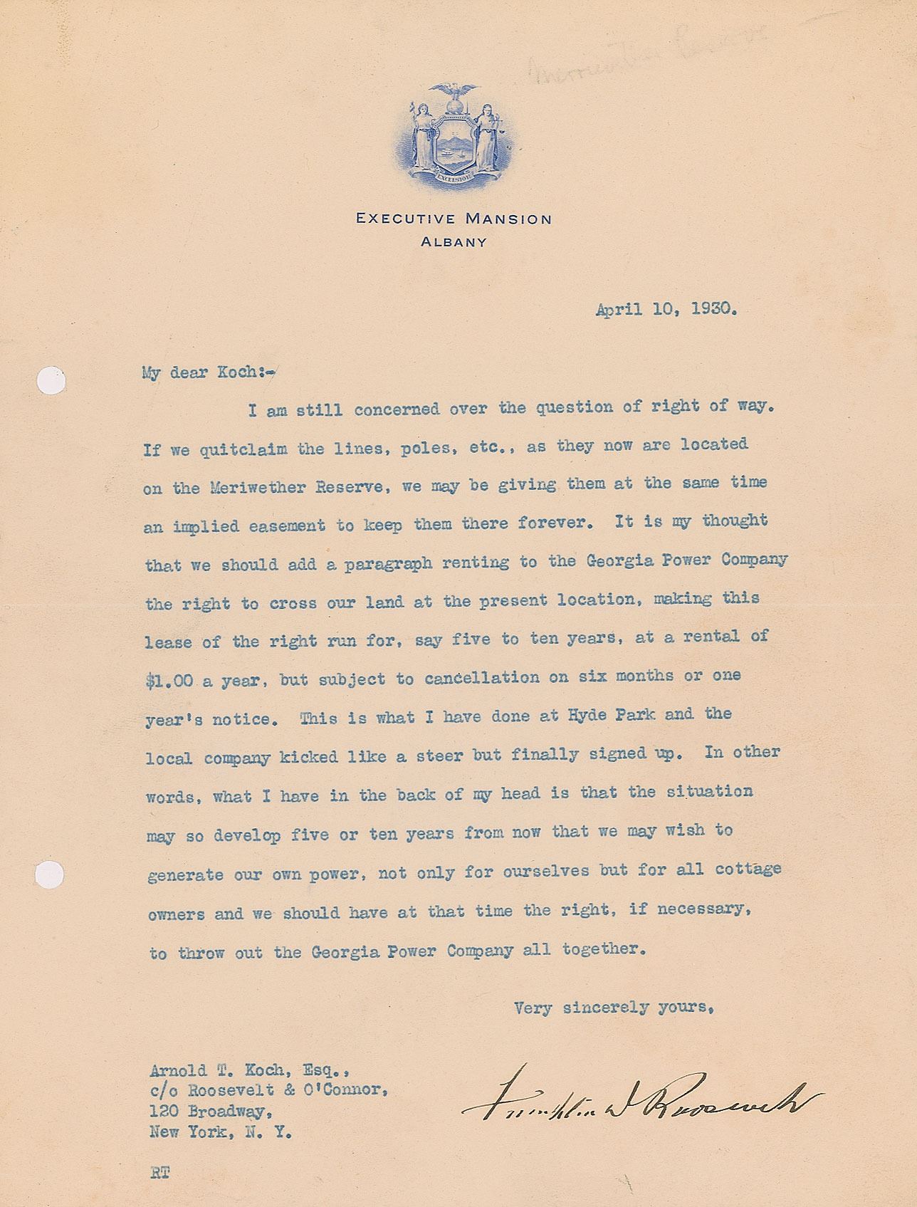 TLS, one page, 8 x 10.5, Executive Mansion letterhead, April 10, 1930. Letter to Arnold T. Koch of the firm Roosevelt & O'Connor, in full: "I am still concerned over the question of right of way. If we quitclaim the lines, poles, etc., as they now are located on the Meriwether Reserve, we may be giving them at the same time an implied easement to keep them there forever. It is my thought that we should add a paragraph renting o the Georgia Power Company the right to cross our land at the present location, making this lease of the right run for, say five to ten years, at a rental of $1.00 a year, but subject to cancellation on six months or one year's notice. This is what I have done at Hyde Park and the local company kicked like a steer but finally signed up. In other words, what I have in the back of my head is that the situation may so develop five or ten years from now that we may wish to generate our own power, not only for ourselves but for all cottage owners and we should have at that time the right, if necessary, to throw out the Georgia Power Company all together." In fine condition, with two file holes to the left side.