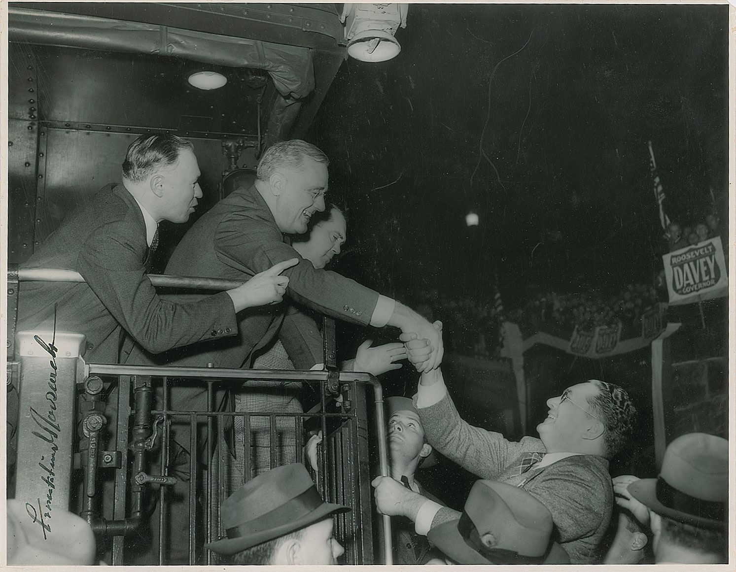 Striking vintage glossy 13.5 x 10.5 photo of FDR on a whistle stop tour for one of his presidential campaigns, signed vertically in fountain pen, "Franklin D. Roosevelt." In very good to fine condition, with overall crazing to the emulsion. A fantastic oversized action shot capturing the excitement of Roosevelt's campaign.