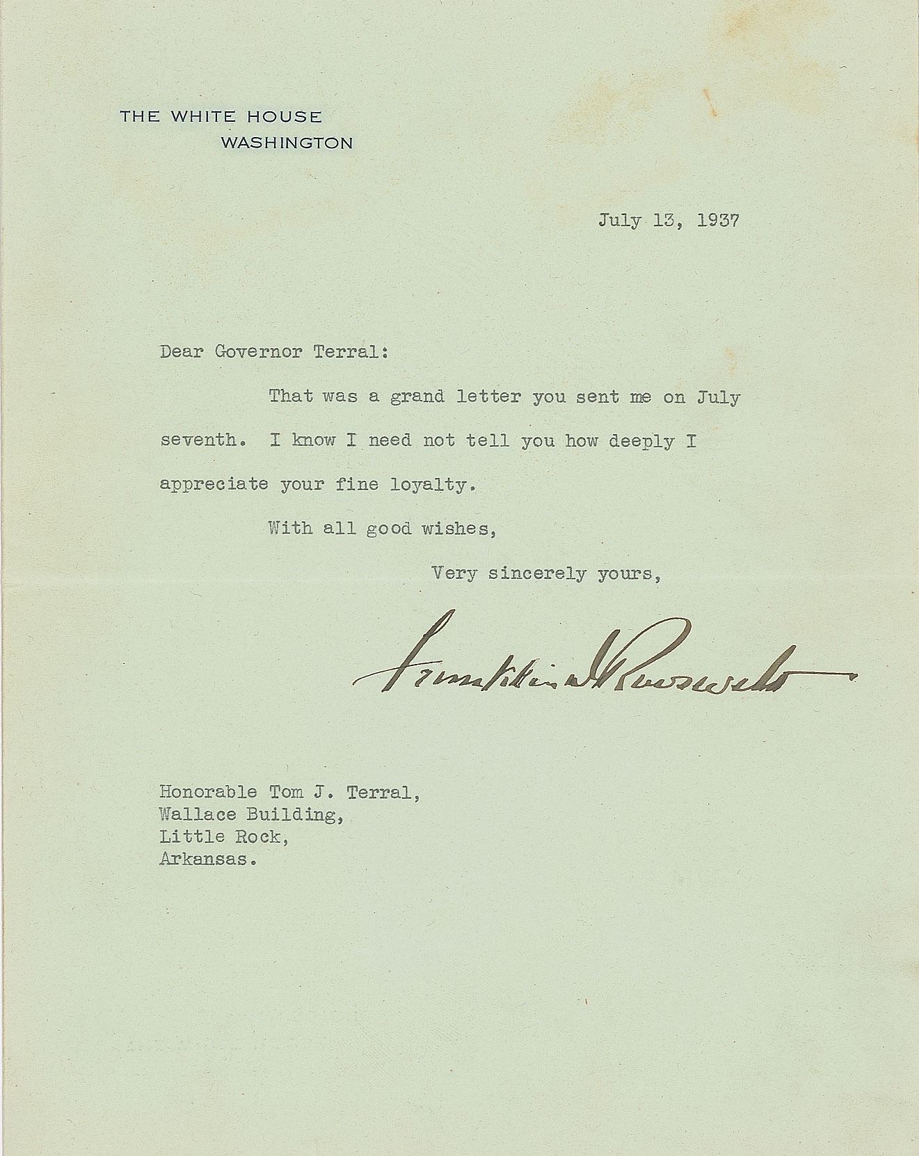 TLS as president, one page, 7 x 8.75, White House letterhead, July 13, 1937. Letter to Tom Terral, former governor of Arkansas. In full: "That was a grand letter you sent me on July seventh. I know I need not tell you how deeply I appreciate your fine loyalty." In fine condition, with light staining to the upper right, and a light crease across the lower blank area.