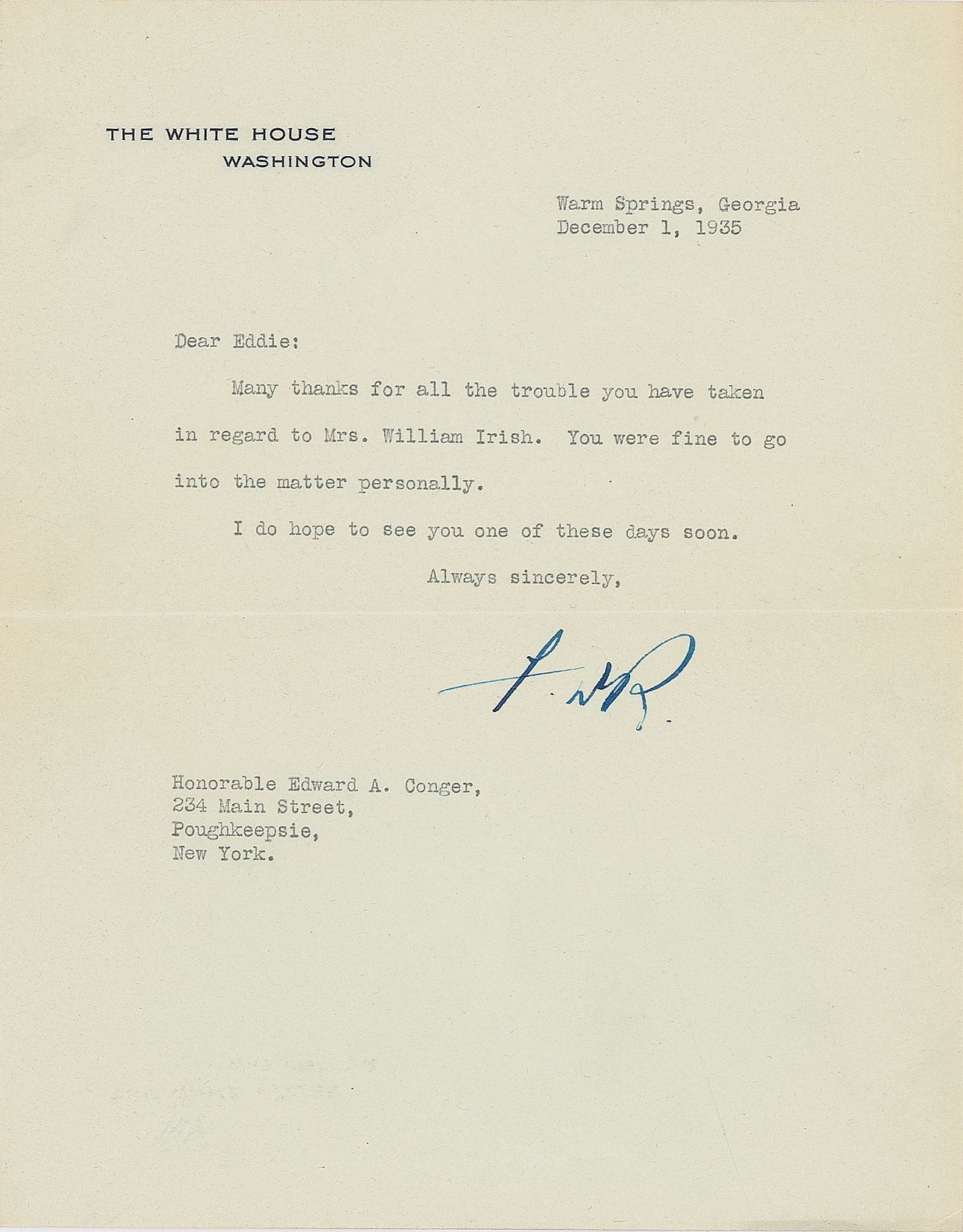 TLS signed “F.D.R.,” one page, 7 x 8.75, White House letterhead, December 1, 1935. Letter to the Hon. Edward A. Conger, in full: "Many thanks for all the trouble you have taken in regard to Mrs. William Irish. You were fine to go into the matter personally. I do hope to see you one of these days soon." In fine condition. Following a distinguished legal career in New York as a judge and attorney, Conger was appointed by FDR to a new seat on the United States District Court for the Southern District of New York in 1938; he remained on the bench until his death in 1963.