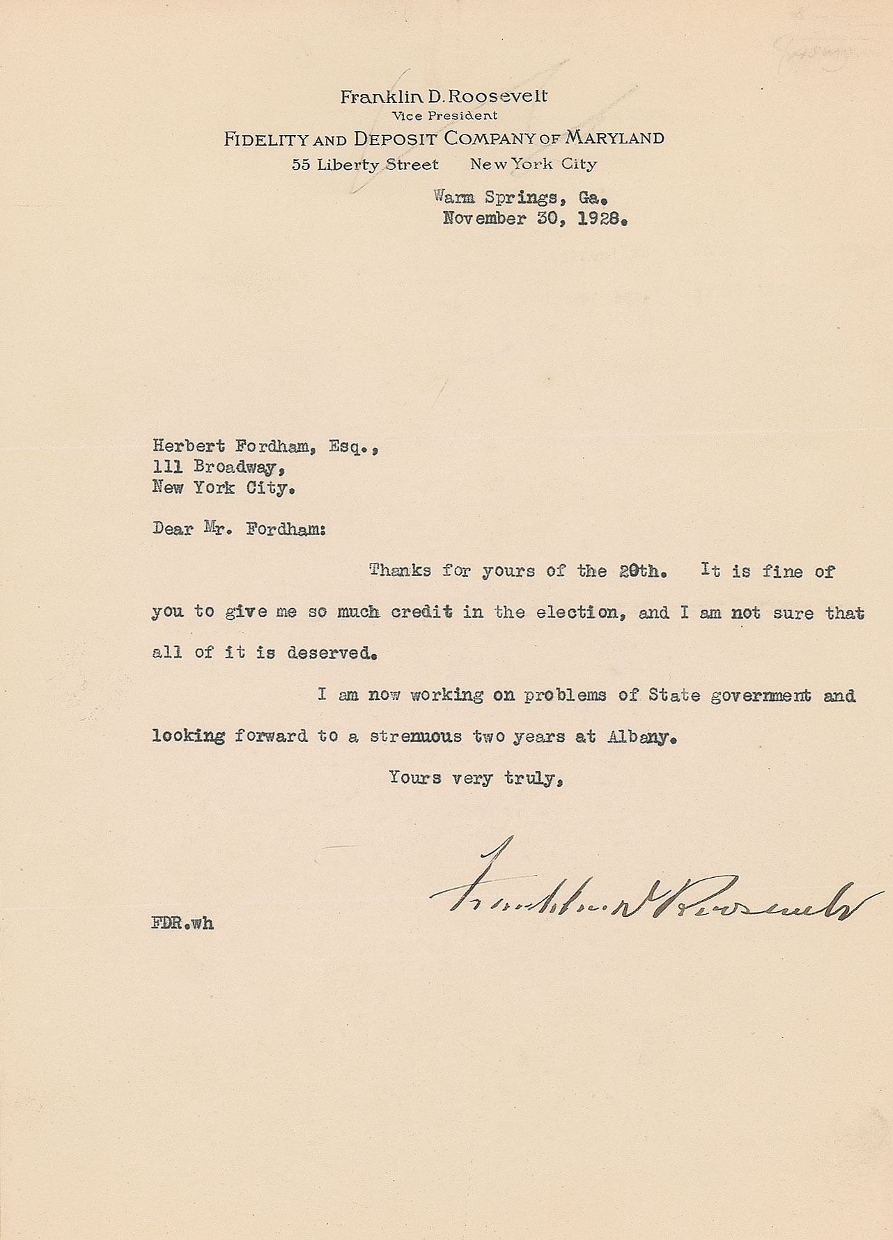 TLS, one page, 7.25 x 10.5, Fidelity and Deposit Company of Maryland letterhead, November 30, 1928. Letter to Herbert Fordham, in full: "Thanks for yours of the 20th. It is fine of you to give me so much credit in the election, and I am not sure that all of it is deserved. I am now working on problems of State government and looking forward to a strenuous two years at Albany." In fine condition.