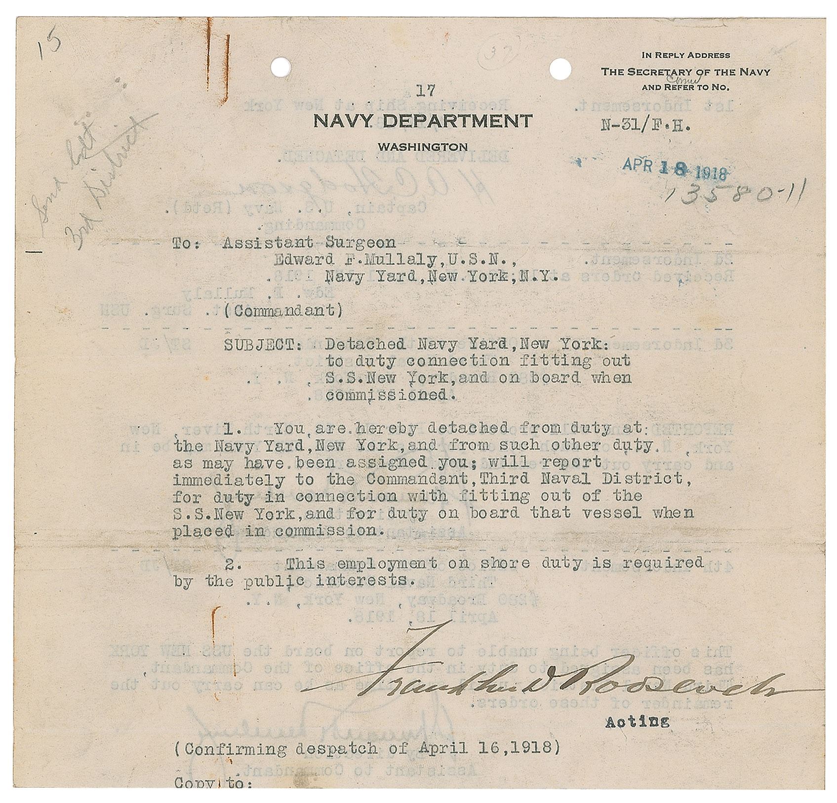 World War I-dated DS, one page, 8 x 7.5, April 18, 1918. An official dispatch from the Navy Department addressed to Assistant Surgeon Edward F. Mullaly, with subject reading: "Detached Navy Yard, New York: to duty connection fitting out S.S. New York, and on board when commissioned." The letter reads: "1. You are hereby detached from duty at the Navy Yard, New York, and from such other duty as may have been assigned you; will report immediately to the Commandant, Third Naval District, for duty in connection with fitting out of the S.S. New York, and for duty on board that vessel when placed in commission. 2. This employment on shore duty is required by the public interests." Signed at the conclusion by Franklin D. Roosevelt as Assistant Secretary of the Navy. In very good to fine condition, with a rusty paperclip impression to the top edge, multiple horizontal folds, and a trimmed bottom edge.