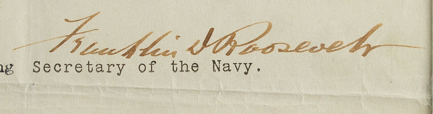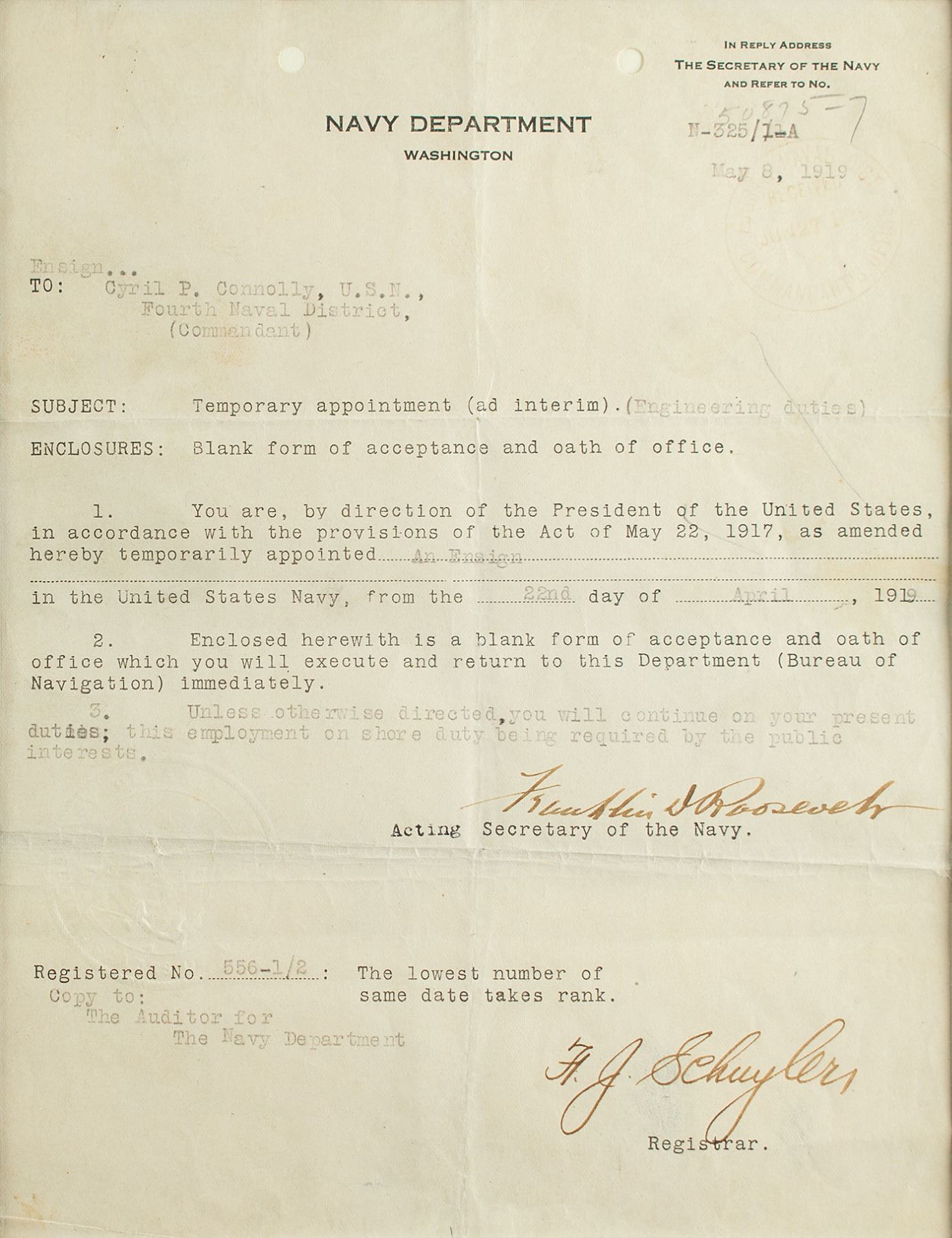 DS, one page, 7.75 x 10, May 8, 1919. Official Navy Department document granting Cyril P. Connolly a temporary appointment as "An Ensign in the United States Navy." Neatly signed at the conclusion by Acting Secretary of the Navy Franklin D. Roosevelt, and countersigned by a registrar. Double-matted and framed with a portrait to an overall size of 19.5 x 15.5. In very good to fine condition, with light soiling and creasing, and two file holes at the top.