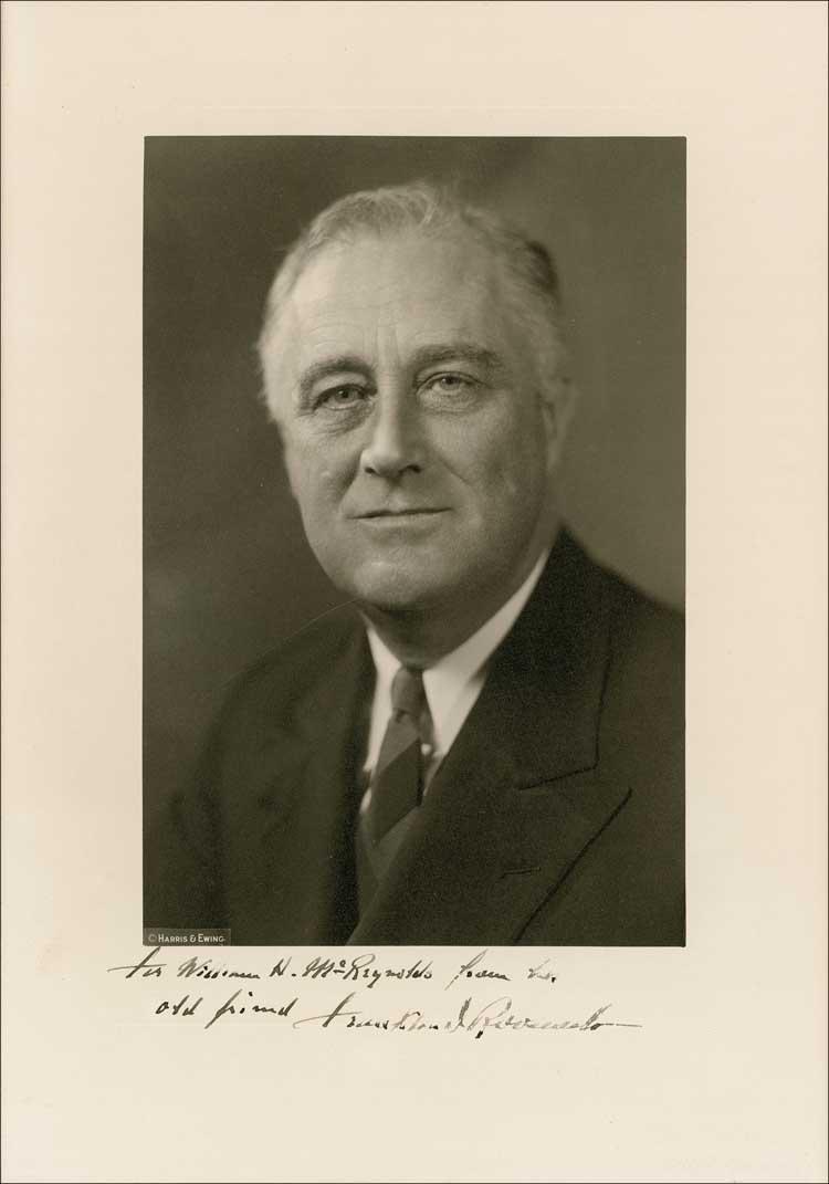 Vintage matte-finish 9.25 x 13.25 Harris and Ewing head-and-shoulders photo, signed and inscribed below the image in fountain pen “For William H. McReynolds from his old friend, Franklin D. Roosevelt.” In fine condition, with some light skipping to signature. Pre-certified John Reznikoff/PSA/DNA and RRAuction COA.